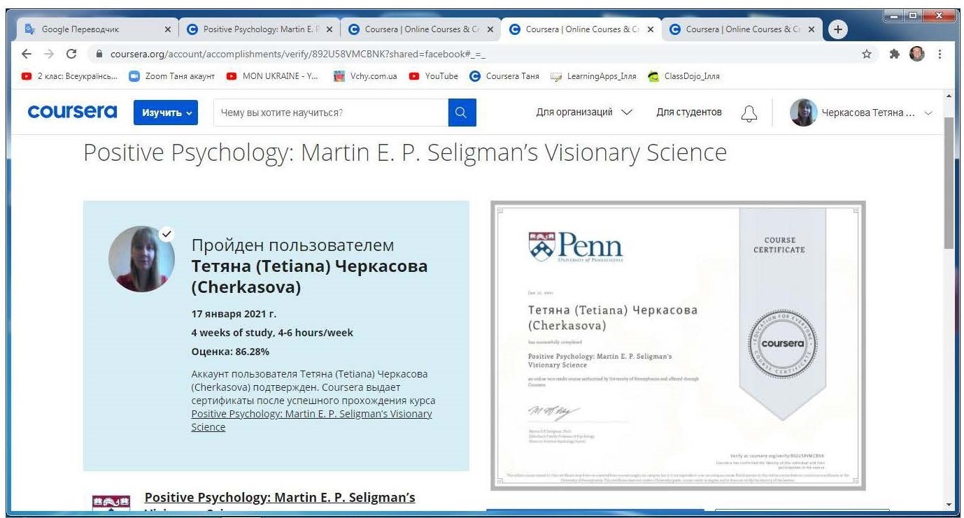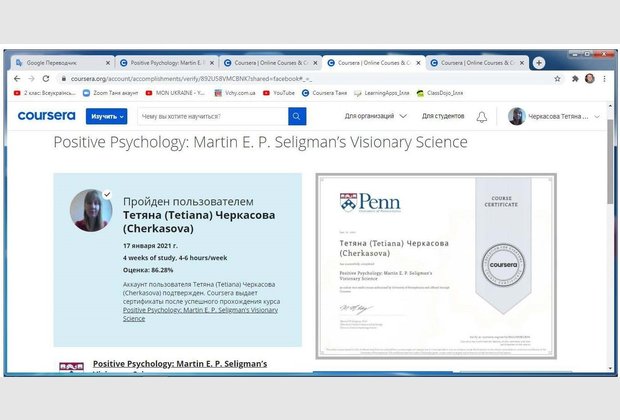 Старший викладач кафедри психології Хмельницького інституту МАУП Черкасова Тетяна Михайлівна пройшла міжнародне стажування з курсу «Позитивна психологія»