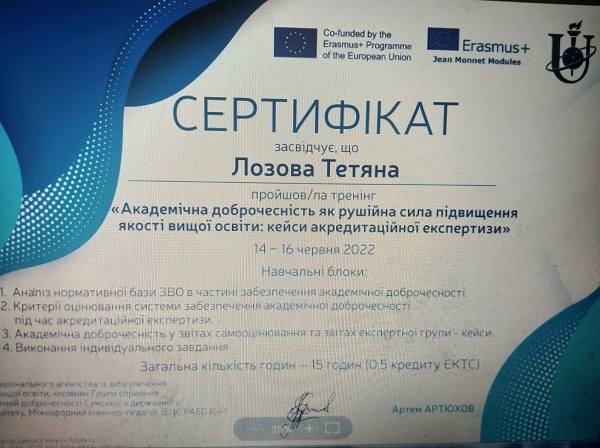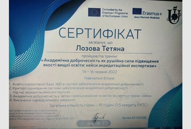 Старший викладач кафедри управління, фінансів та адміністрування Одеського інституту МАУП, кандидат економічних наук Тетяна ЛОЗОВА взяла участь у триденному тренінгу "Академічна доброчесність як рушійна сила підвищення якості вищої освіти: кейси акредитаційної експертизи", який відбувся в межах проєкту Erazmus+ за участі працівників НАЗЯВО.