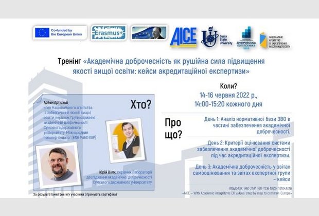 Спікери тренінгу: Артем АРТЮХОВ - член Національного агентства із забезпечення якості вищої освіти, керівник Групи сприяння академічної доброчесності Сумського державного університету, Міжнародний інженер-педагог (ENG PAED IGIP); Юрій ВОЛК - керівник Лабораторії дослідження академічної доброчесності Сумського державного університету.
