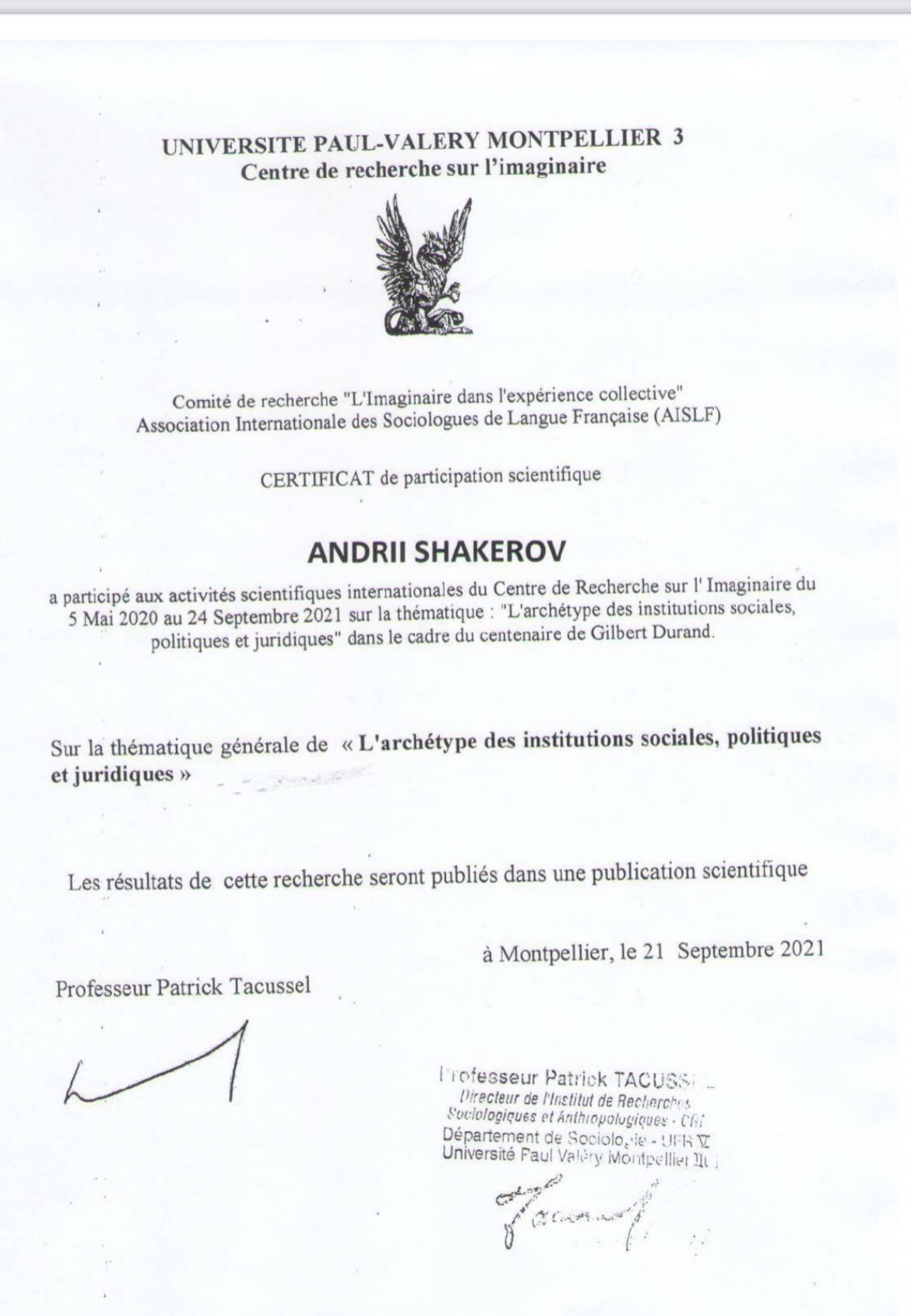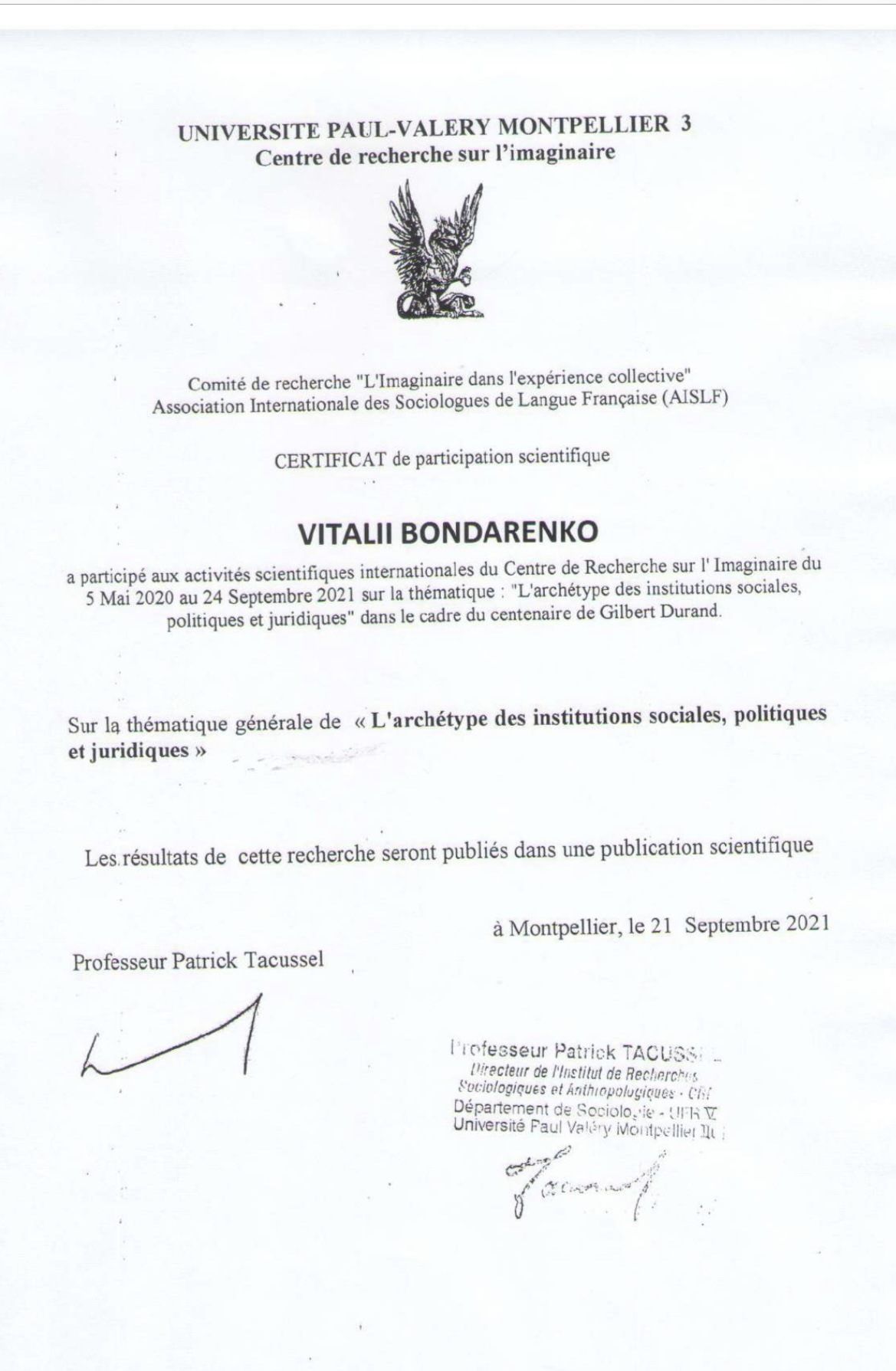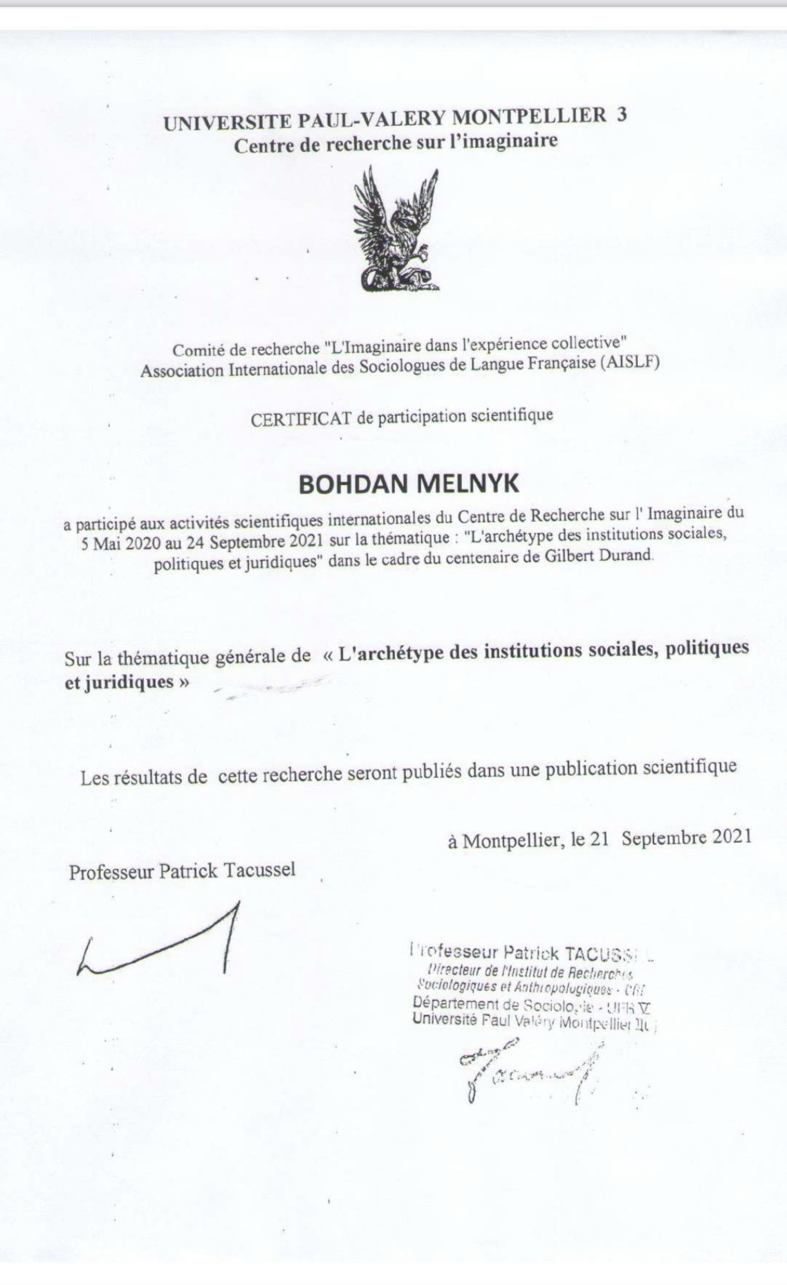 Впродовж травня-вересня 2021 року аспіранти Навчально-наукового інституту управління, економіки та бізнесу проходили дистанційне стажування в Університеті Монпельє (Франція). Стажування та тему сучасних методів міждисциплінарних досліджень передбачало дистанційну участь у заходах, організованих Центром дослідження сучасності та повсякденності Університету Монпельє-3 ім. Поля Валері та Української школи архетипіки (КНУ ім. Т. Шевченка).