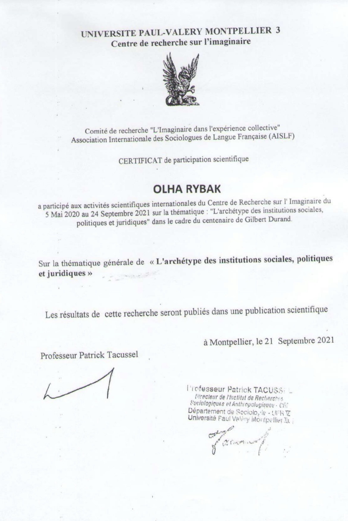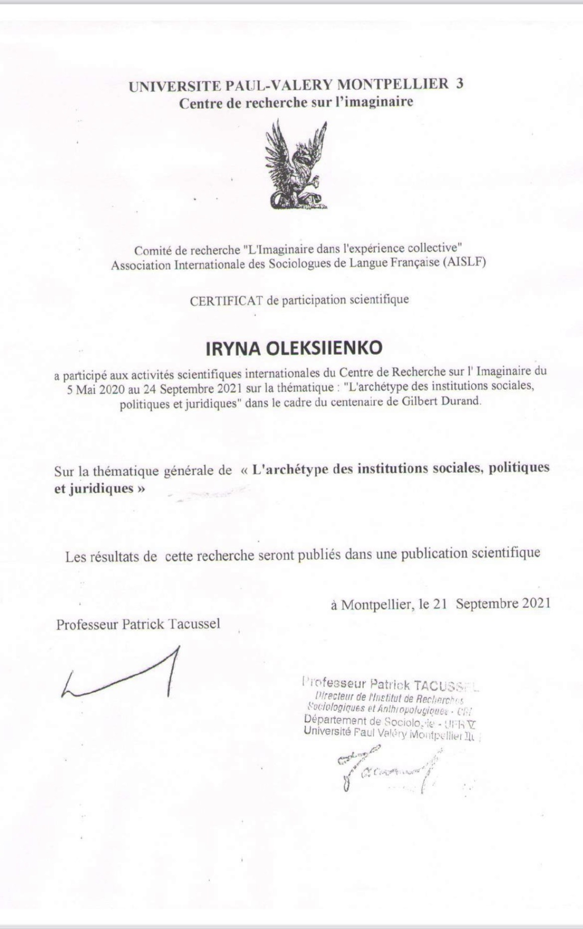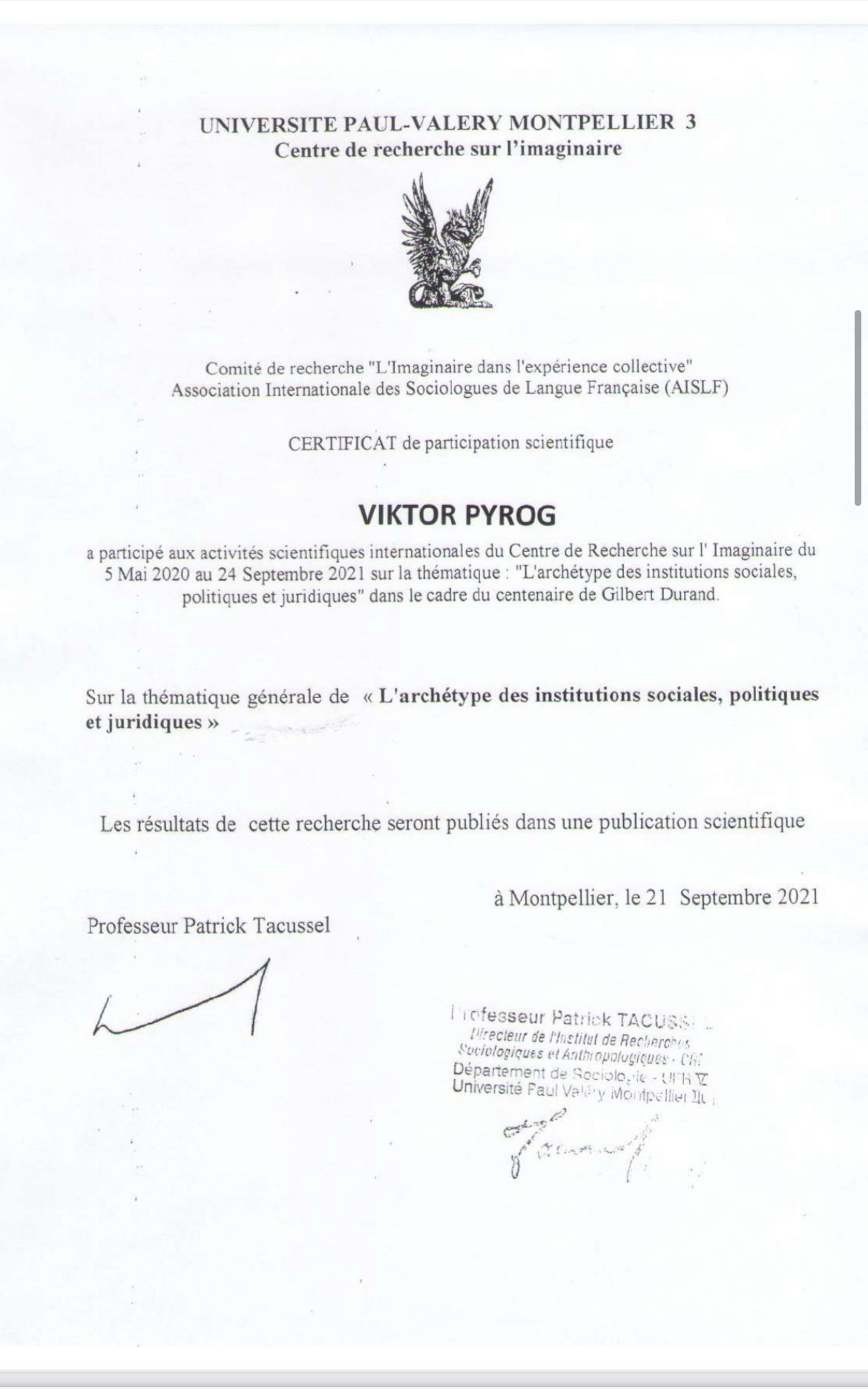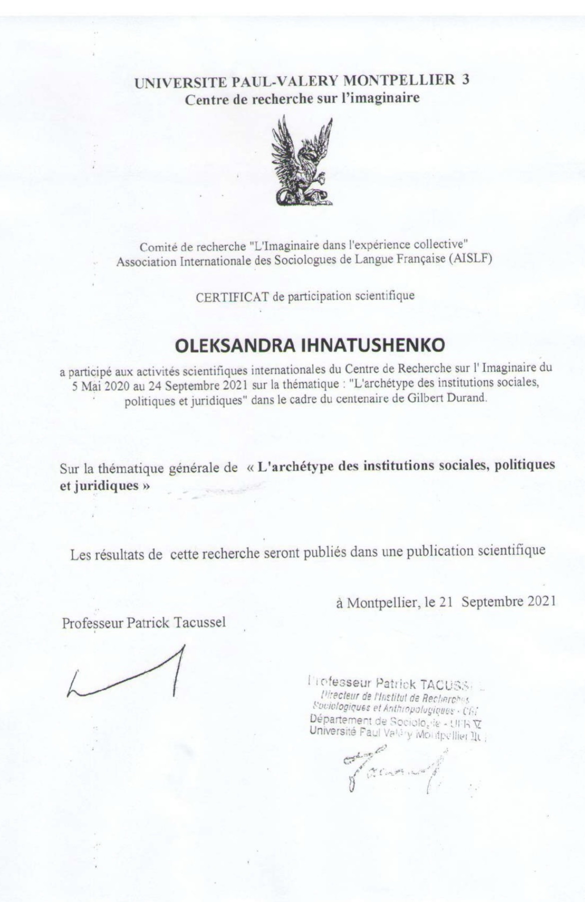 Впродовж травня-вересня 2021 року аспіранти Навчально-наукового інституту управління, економіки та бізнесу проходили дистанційне стажування в Університеті Монпельє (Франція). Стажування та тему сучасних методів міждисциплінарних досліджень передбачало дистанційну участь у заходах, організованих Центром дослідження сучасності та повсякденності Університету Монпельє-3 ім. Поля Валері та Української школи архетипіки (КНУ ім. Т. Шевченка).