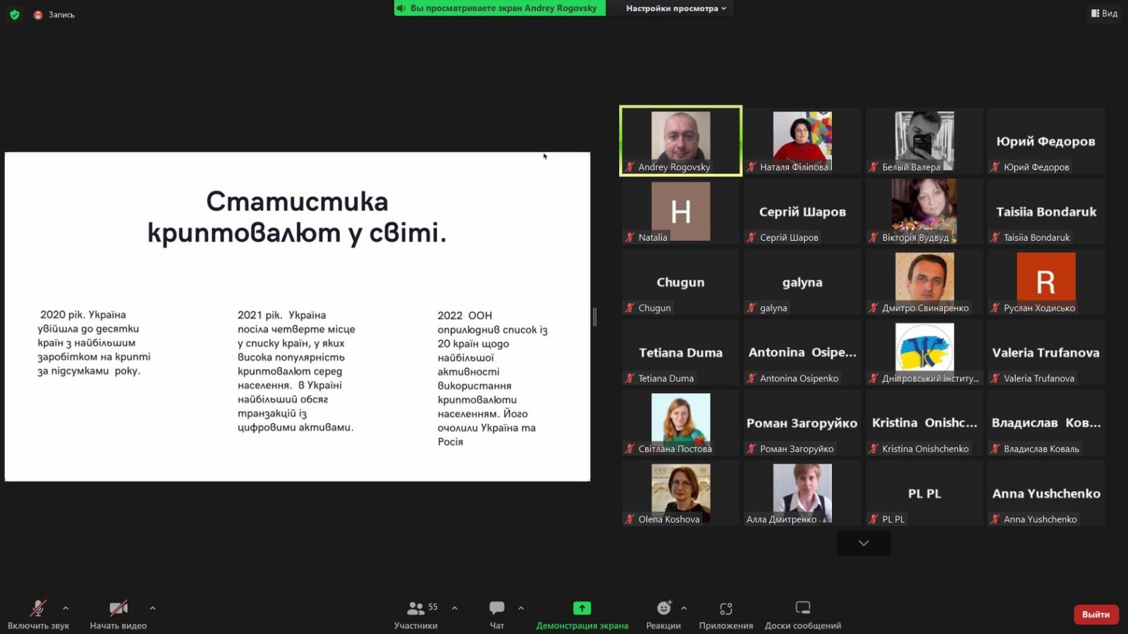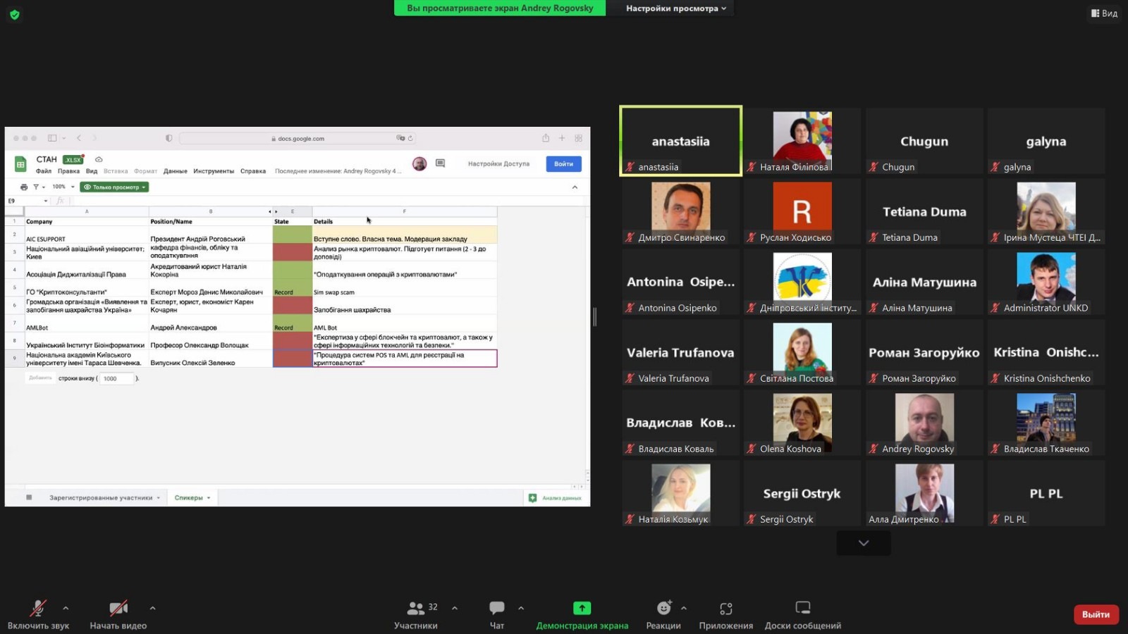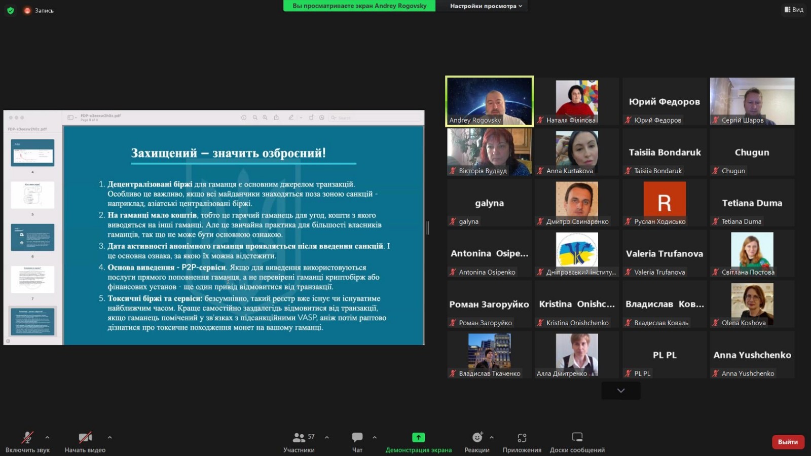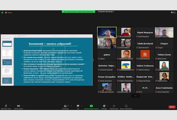 На online зустрічі спікерами було розкрито наступні ключові питання: стан та можливості ринку криптовалют в Україні; системи та схеми захисту криптовалютних активів; планування законодавчого врегулювання криптовалюти в Україні; податки при використанні крипти; питання захисту від «брудної» крипти. Наприкінці зустрічі відбулася дискусія стосовно можливості інвестицій у ринок криптовалюти, захисту крипти, можливості донату крипти на потреби Збройних Сил України.