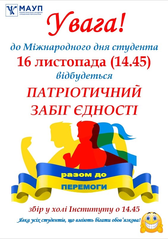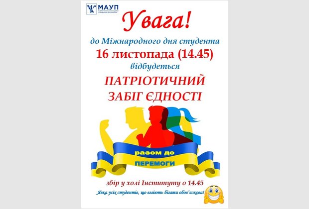 16 листопада, напередодні Міжнародного Дня студента, студенти Хмельницького інституту та економіко-правового фахового коледжу МАУП влаштували «Патріотичний забіг Єдності». Таким чином студенти показали свою єдність та солідарність з студентами нашого закладу, які перебувають у лавах Збройних сил України, у лавах Національної гвардії, територіальної оборони та Національної поліції України.