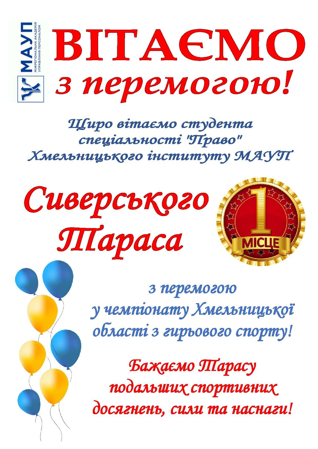 Тарас Сиверський, випускник Хмельницького економіко-правового коледжу МАУП, а зараз студент Хмельницького інституту МАУП спеціальності «Право» став переможцем чемпіонату Хмельницької області з гирьового спорту серед юнаків, дорослих та ветеранів у ваговій категорії 68 кг.