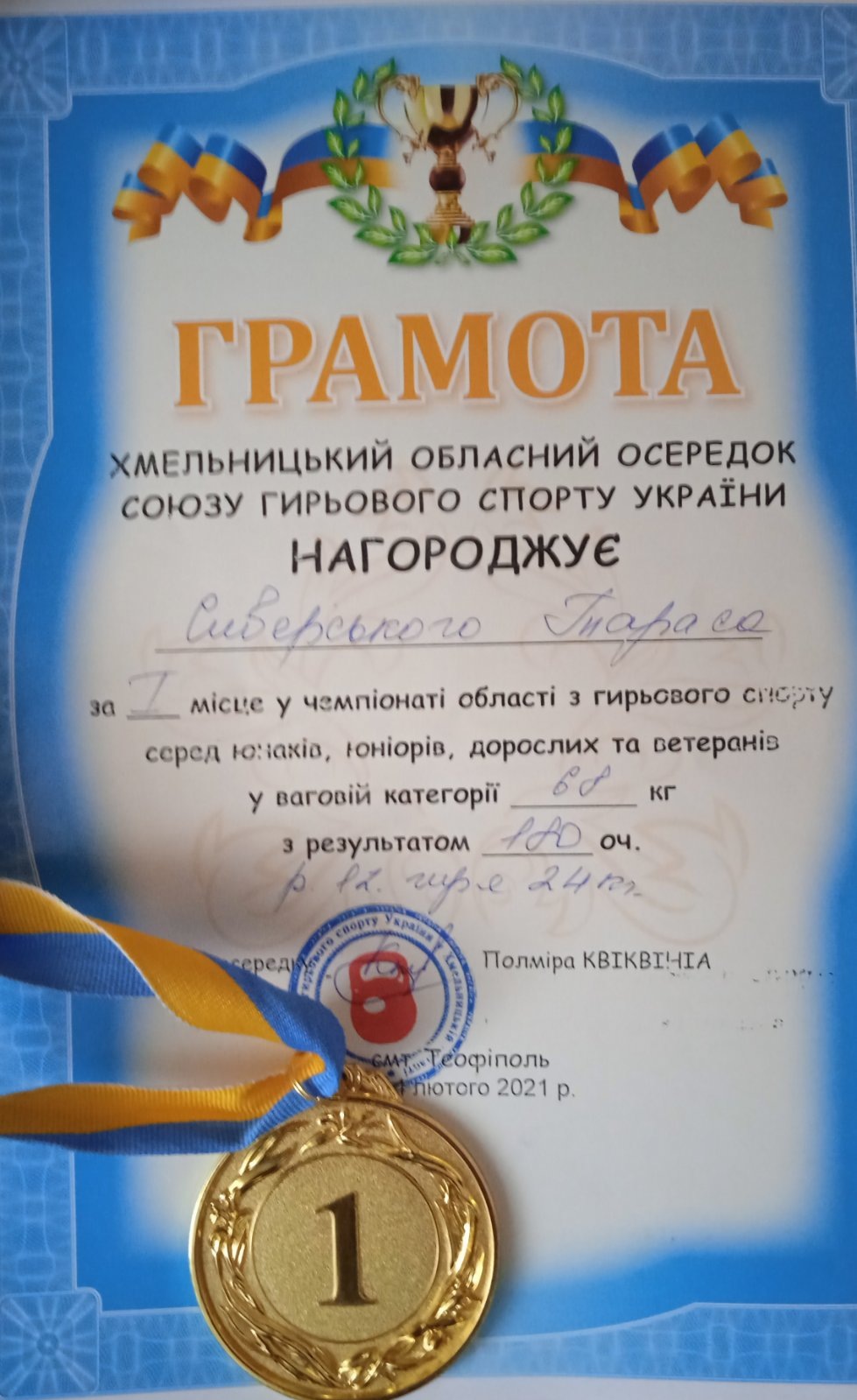 Найвидатнішими досягненнями наших гирьовиків можна вважати результат Федора Усенка з м. Суми у поштовху двох двопудових гир – 149 разів у ваговій категорії до 80 кг, показаний у 1989 році та не перевершений до сьогодні, рекорд у ривку Юрія Петренка з міста Черкаси – по 110 підйомів кожною рукою (1998); а також досягнення тринадцятиразового чемпіона світу Романа Михальчука з міста Луганська, який першим серед гирьовиків України удостоєний високого спортивного звання «Заслужений майстер спорту України». Сподіваємося, що і наш Тарас скоро досягне таких вершин!