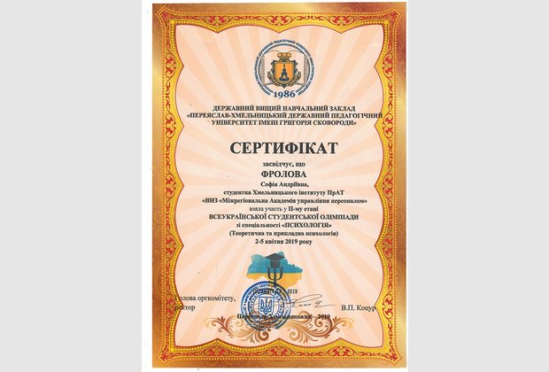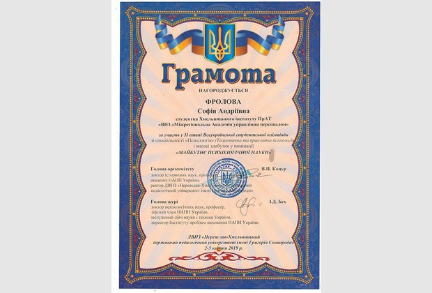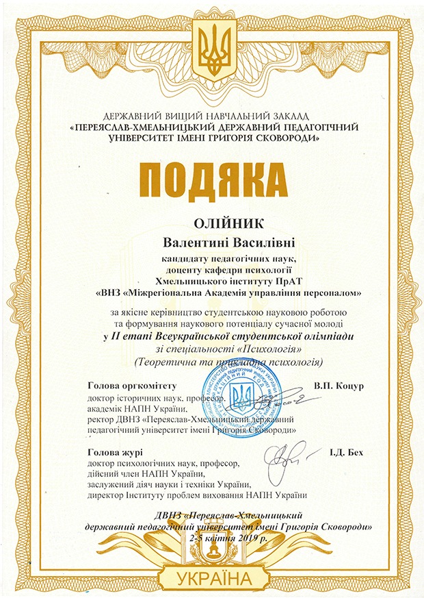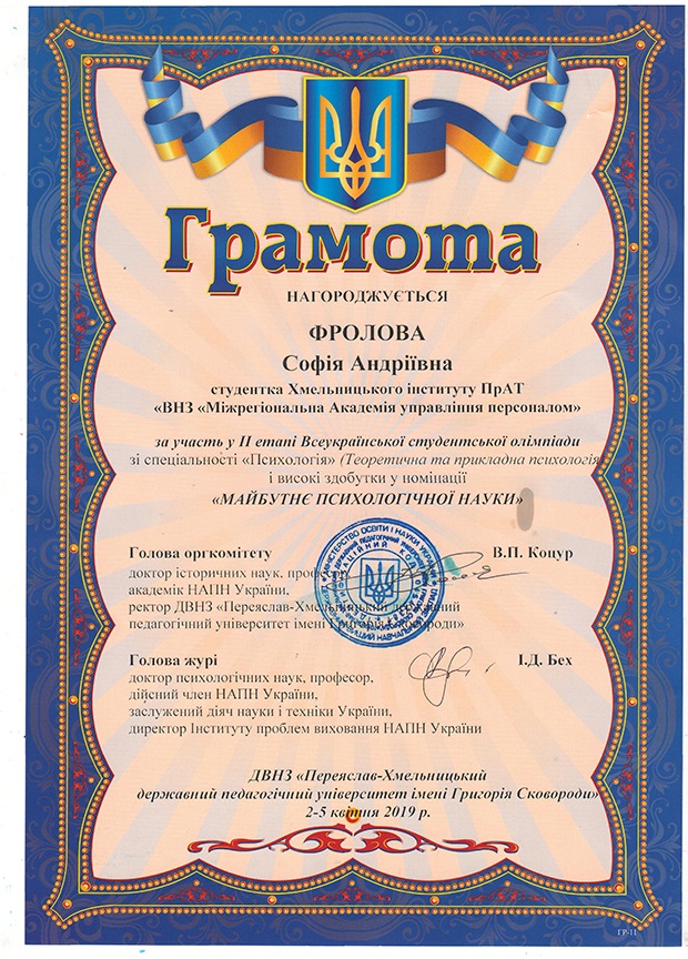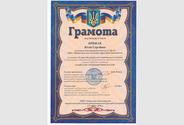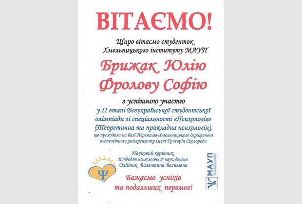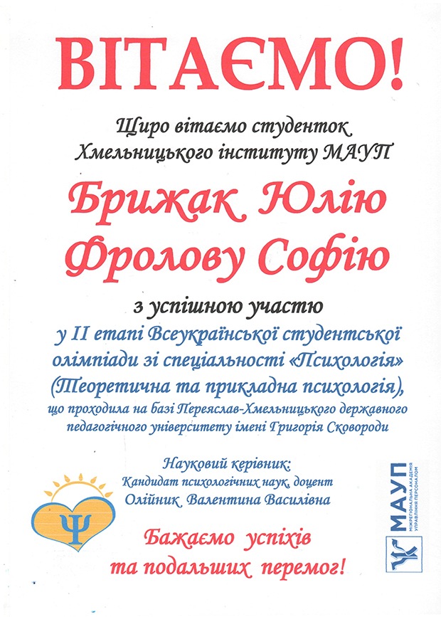 Інститут представляли студентки Брижак Юлія та Фролова Софія, які виступали на Олімпіаді під керівництвом завідувача кафедри психології Олійник Валентини Василівни.