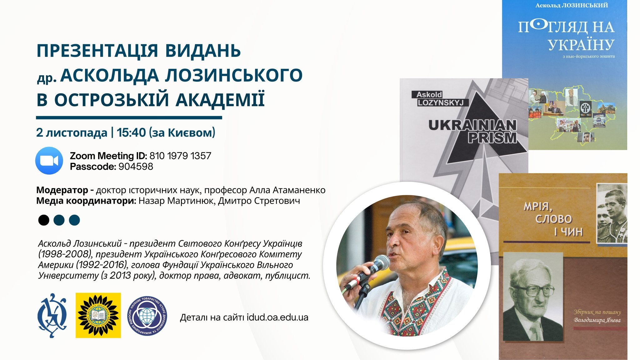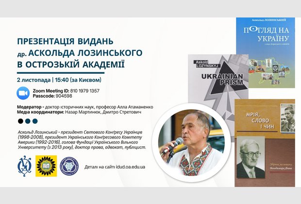 - Англомовне видання “Ukrainian Prism” (2022) вийшло друком у Видавництві Національного університету «Острозька академія» завдяки співпраці Аскольда Лозинського та Інституту досліджень української діаспори імені професора Любомира Винара НаУОА.