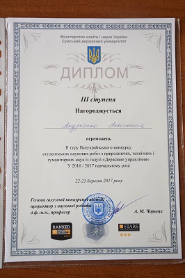 Так, студентка Українсько-Азербайджанського інституту соціальних наук і самоврядування ім. Г.А.Алієва Анастасія Андрієнко отримала диплом ІІІ ступеня за перемогу у ІІ турі Всеукраїнського конкурсу студентських наукових робіт з природничих, технічних і гуманітарних наук із галузі «Державне управління», тема дослідження «Соціальний захист населення України на сучасному етапі». у 2016/2017 навчальному році.
