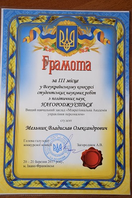 А магістрант Інституту міжнародних відносин та лінгвістики ім. Аверроеса Владислав Мельник здобув грамоту за ІІІ місце у Всеукраїнському конкурсі студентських наукових робіт з політичних наук, науковий керівник – кандидат політичних наук, доцент, Боринська Ольга Леонідівна. Тема дослідження: «Ідея єдиної Європи: становлення та реалізація». (http://www.pu.if.ua/uk/novyny/5962-2017)