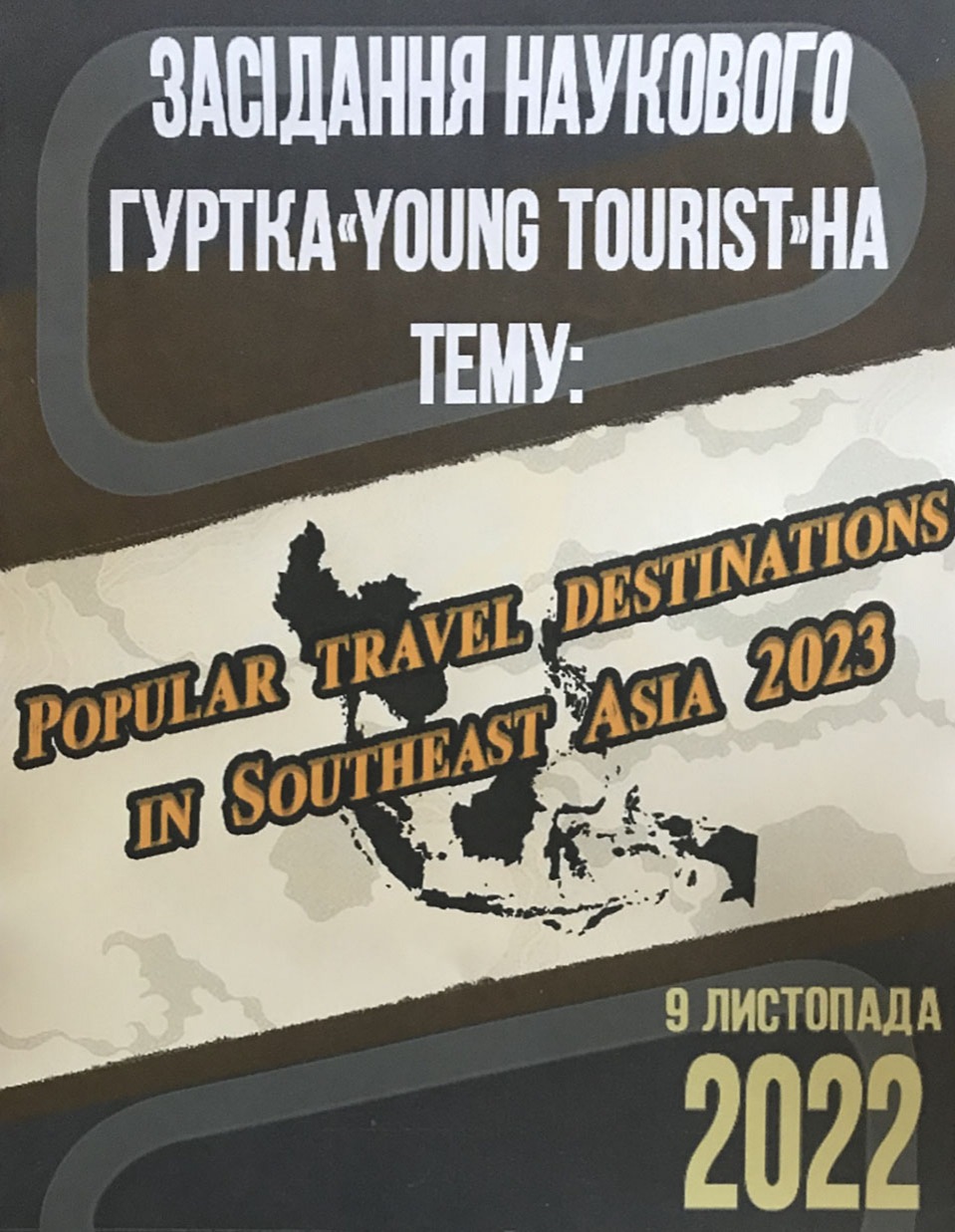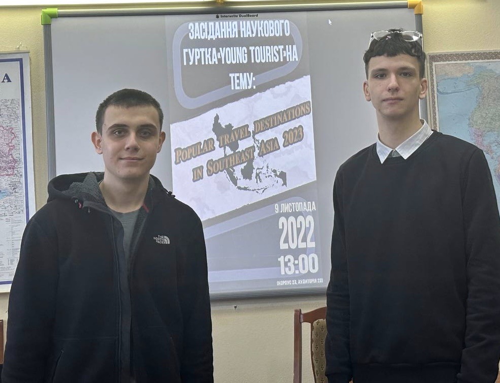 9 листопада 2022 року відбулося засідання наукового гуртка «Young tourist» (Кафедра організації туристичної діяльності ННІУЕБ) на тему: «Popular travel destinations in Southeast Asia 2023» під керівництвом наукового керівника к.е.н., доц. Кривоберець М.М. та голови студентського гуртка, студента 3 курсу спеціальності «Туризм» Міллера В.С. Учасники засідання розглянули та проаналізували такі країни: Тайланд, Індонезія, Бруней, В’єтнам, Філіпіни. В процесі обговорення дослідили розвиток туризму в даних країнах на сьогодні, а також перспективи їх розвитку в 2023 році.