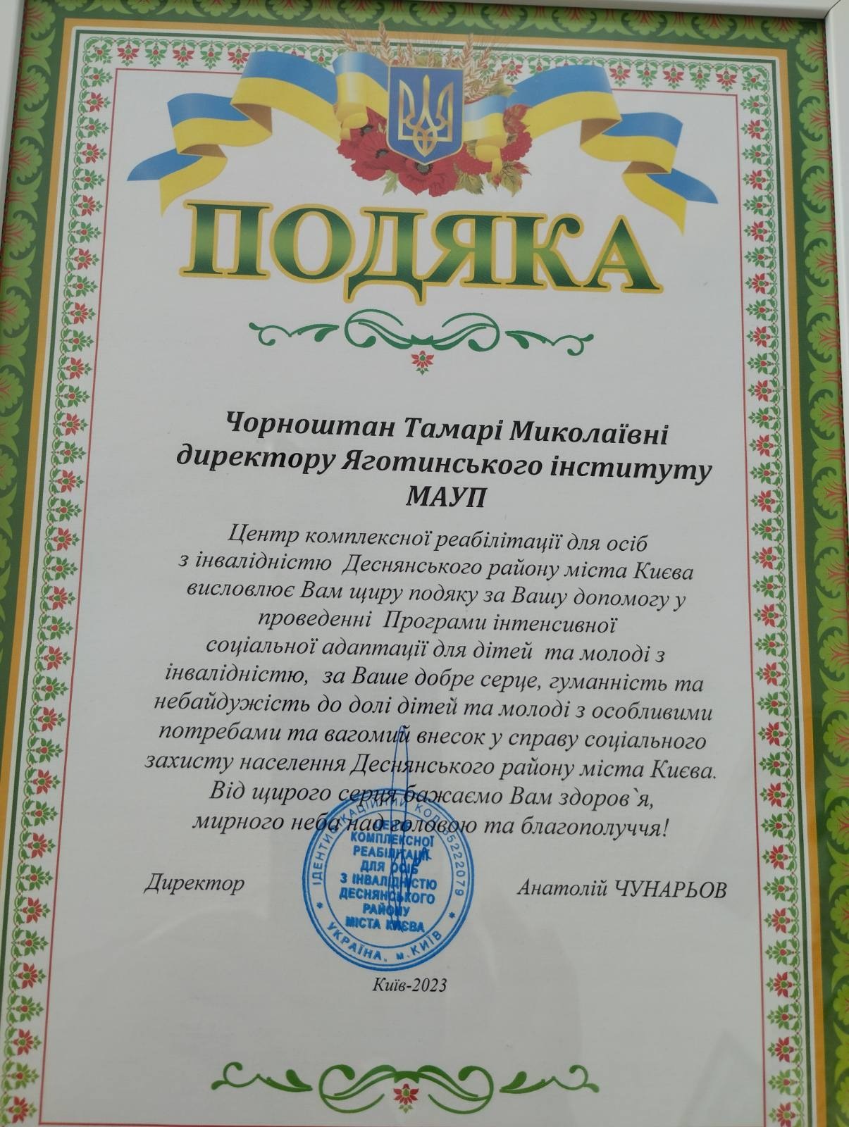 Студенти Яготинського інституту за напрямом підготовки соціальна робота долучилися до програми інтенсивної соціальної адаптації дітей та молоді з інвалідністю Деснянського району м.Києва в м. Яготині. Студентам висловили подяку за гуманність, добре серце, за небайдужість до долі дітей з особливими потребами . До цього заходу долучилися Плюцинській Л, Рогульчик К, Малинці Д, Блощинській Б, Купрієнко В, Сгібнєвій О, НікітченкоТ, Ісай А, Ковалівській О, Гук Н., Винник О., Одиниць С, Карпович О, Гутко Б, Сушко В. Пишаюсь нашими студентами!