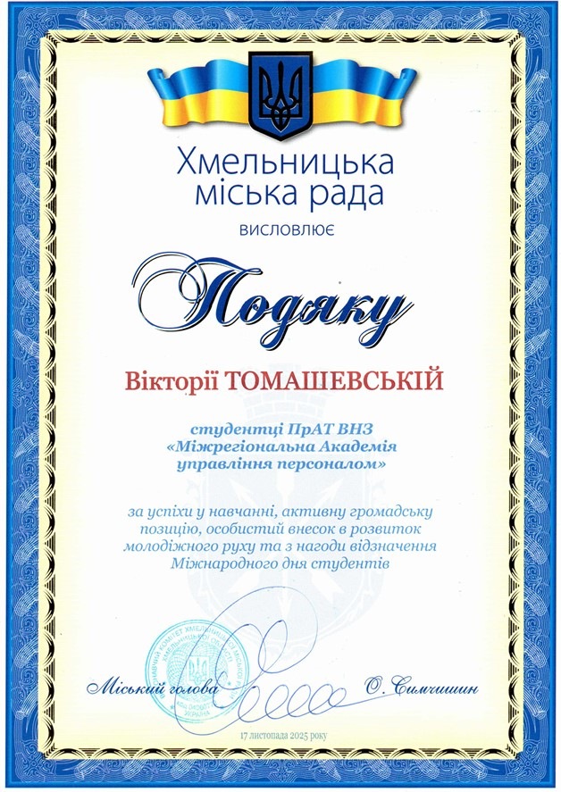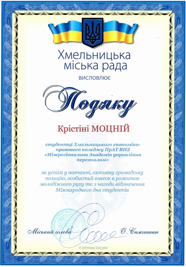 За відмінні успіхи у навчанні, активну громадську позицію та особистий внесок у розвиток молодіжного руху нагороджено Вікторію Томашевську, студентку 3 курсу спеціальності «Правоохоронна діяльність» Хмельницького інституту МАУП та Крістіну Моцну, студентку 4 курсу спеціальності «Право» Хмельницького економіко-правового фахового коледжу МАУП.