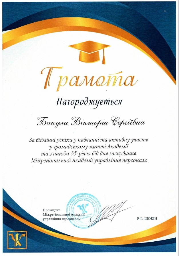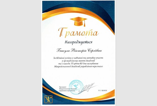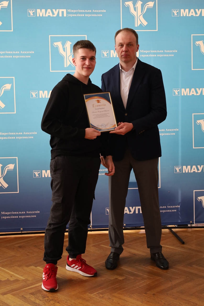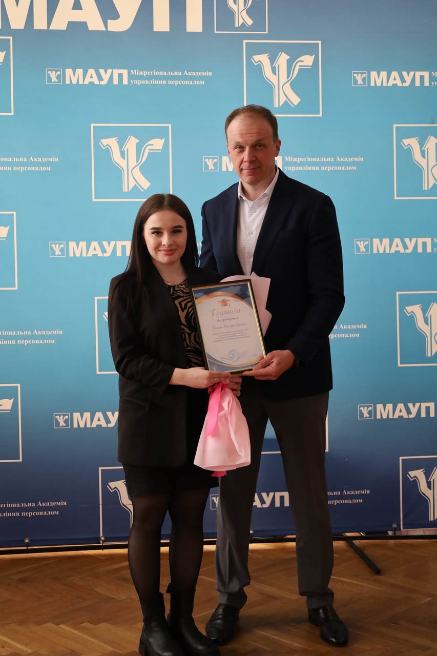 3 квітня 2024 року в конференц-залі Президії Академії відбулося урочисте засідання Вченої ради з нагоди 35-річчя заснування Міжрегіональної Академії управління персоналом на якому було нагороджено студентку Хмельницького інституту МАУП Вікторію Бакулу та студента Хмельницького економіко-правового фахового коледжу МАУП Влада Кісілевича.