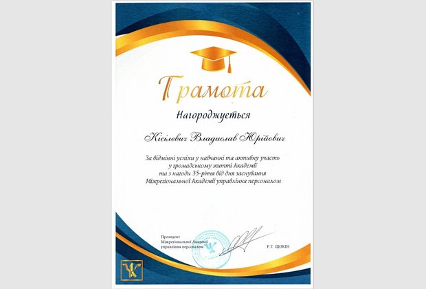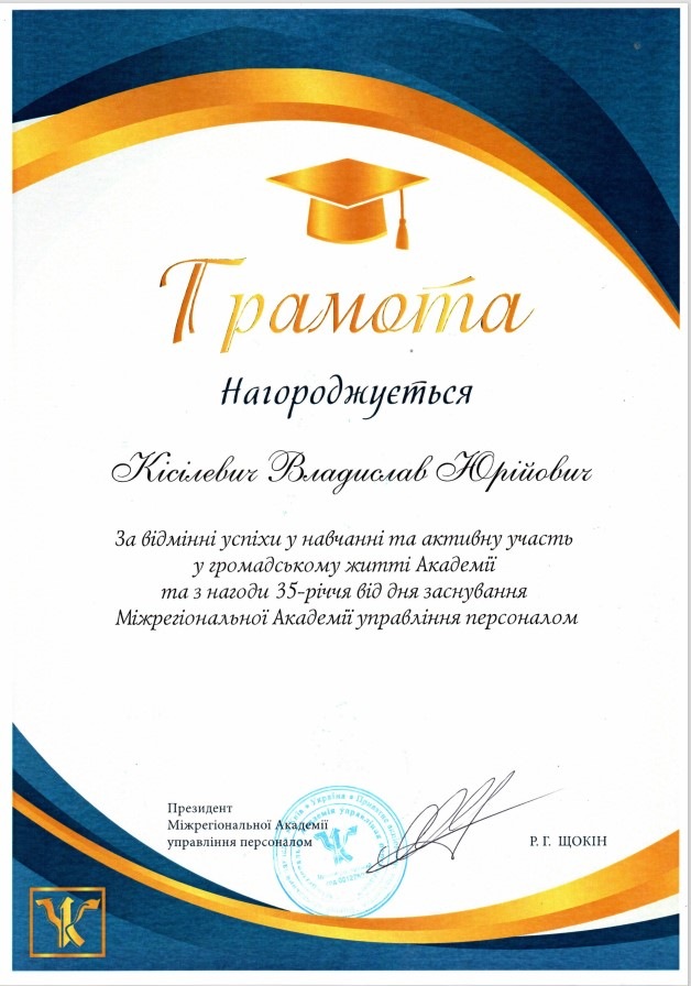 Кісілевич Владислав став переможцем Рейтингу «Якість освіти – 2023» та був нагороджений іменним Дипломом, а від Президента Академії Ростислава Георгійовича Щокіна отримав знижку в оплаті за навчання.
