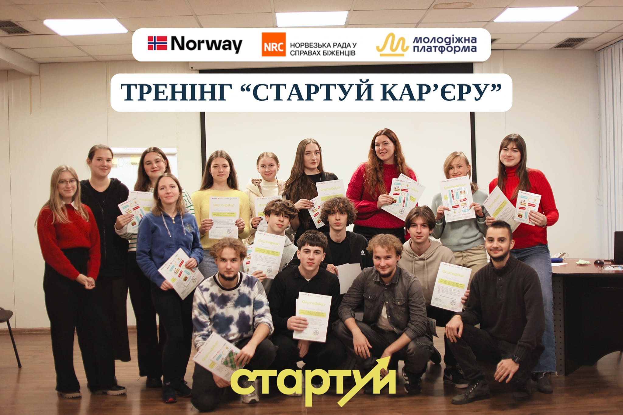 Тренінг "Стартуй кар’єру" проходить в рамках проєкту «Стартуй: кар’єра та власна справа», що реалізується ГО "Молодіжна Платформа" за сприяння Норвезької ради у справах біженців (NRC) в Україні та за фінансової підтримки Норвезької агенції з розвитку співробітництва (NORAD) NGO Youth Platform \ ГО "Молодіжна Платформа"
