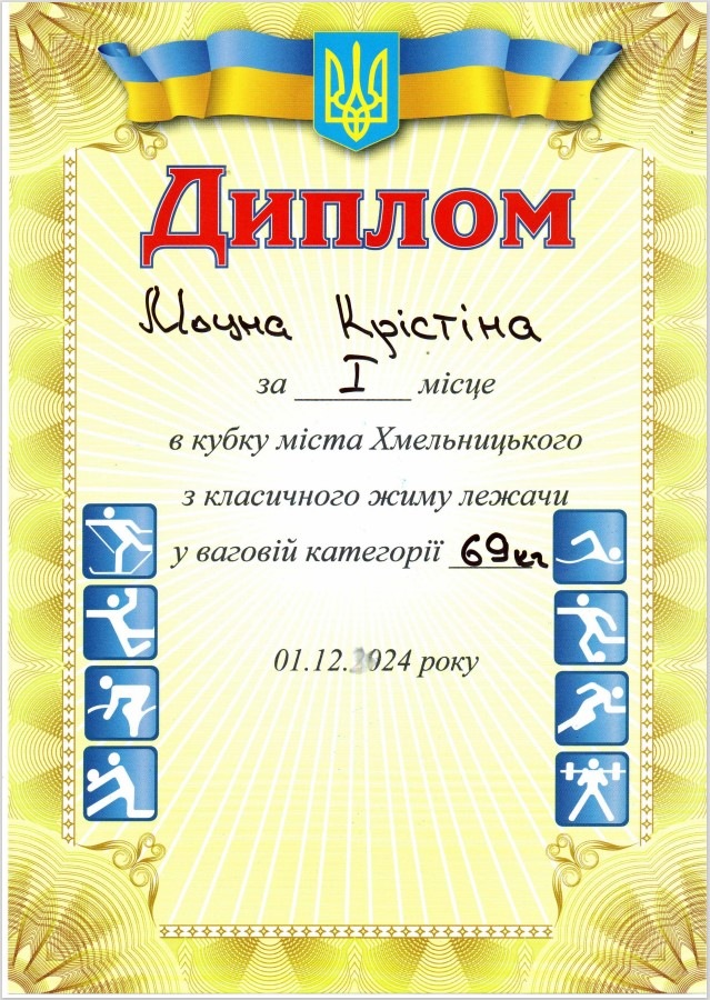 1 грудня 2024 року відбувся Кубку міста Хмельницького з класичного жиму лежачи. У змаганнях взяла участь студентка 3 курсу спеціальності «Право» Хмельницького економіко-правового фахового коледжу МАУП Крістіна Моцна.