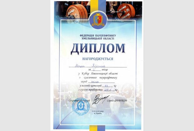 У змаганнях прийняло участь понад п'ятдесят учасників різної вікової та вагової категорії. За наслідками змагань журі Федерації пауерліфтингу Хмельницької області першість у Кубку Хмельницької області з класичного пауерліфтингу серед жінок у ваговій категорії 69 кг за сумою триборства 217, 5 кг віддало студентці другого курсу групи КП-21 Хмельницького економіко-правового фахового коледжу МАУП Моцній Крістіні.