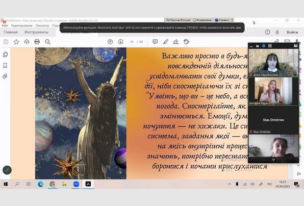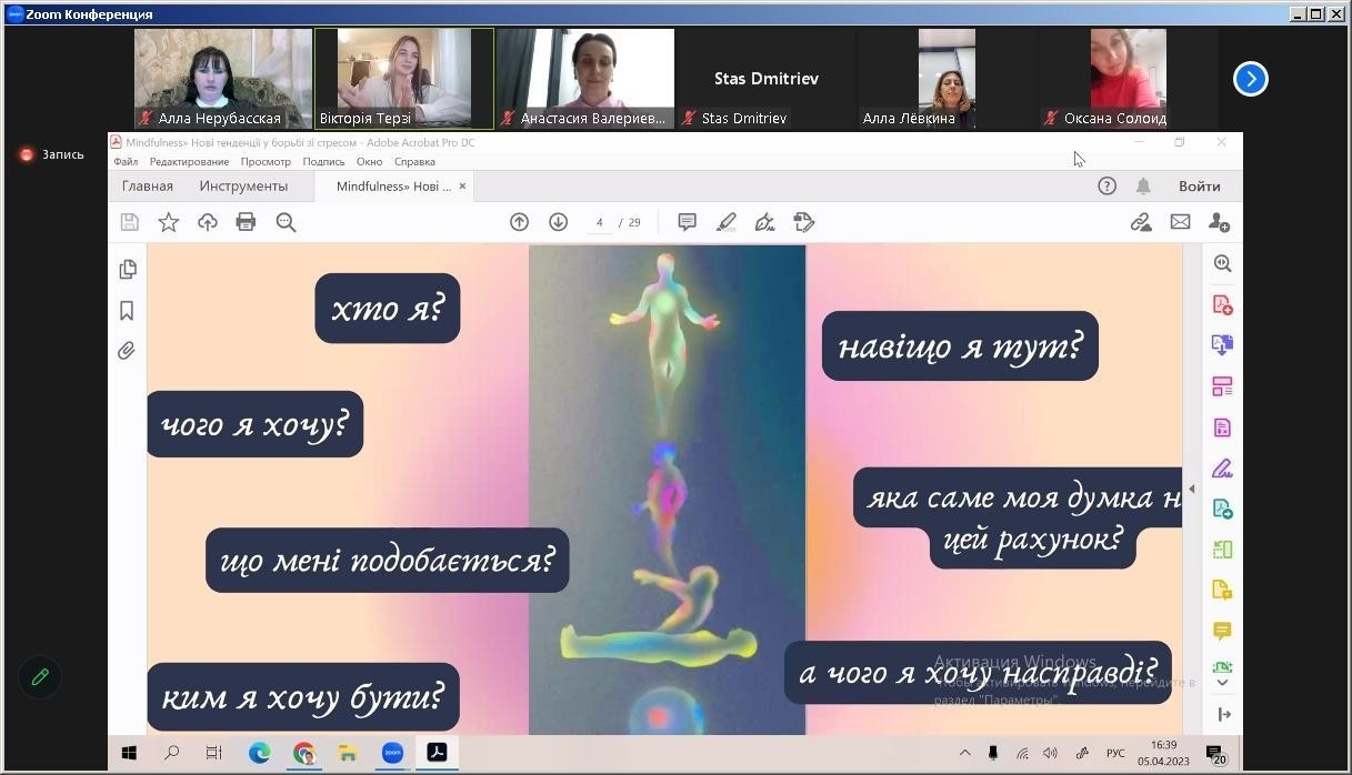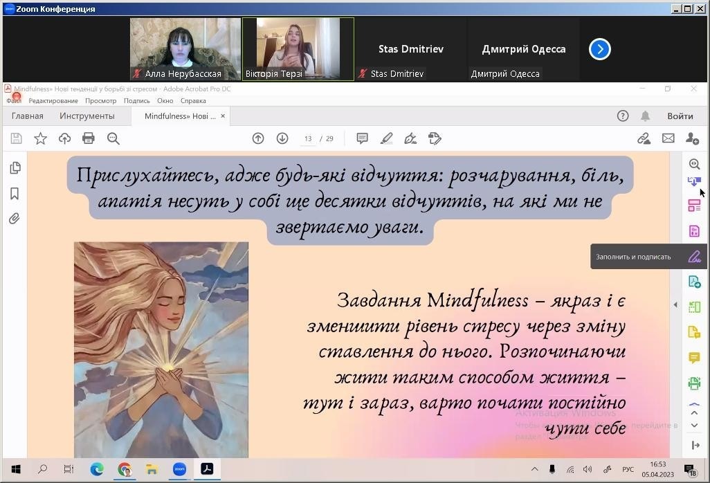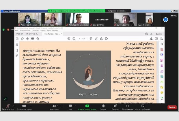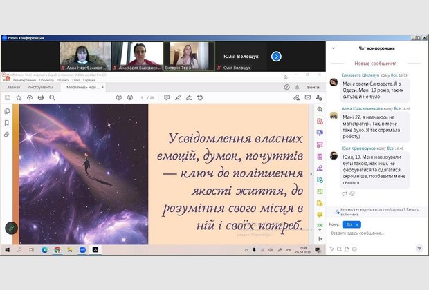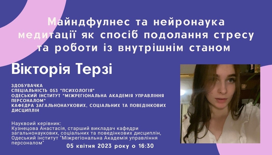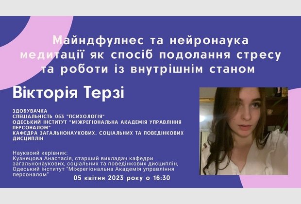 5 квітня 2023 року студентка 2 курсу Одеського інституту МАУП спеціальності «Психологія» Вікторія Терзі прийняла участь у Всеукраїнському конкурсі майстер-класів студентів-психологів від Асоціації психологів вищої школи України з темою «Майндфулнес та нейронаука медитації, як спосіб подолання стресу та роботи із внутрішнім станом», науковий керівник, старший викладач кафедри загальнонаукових, соціальних та поведінкових дисциплін Анастасія Валеріївна Кузнецова.