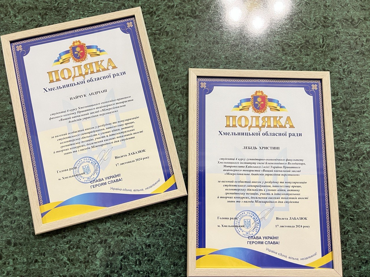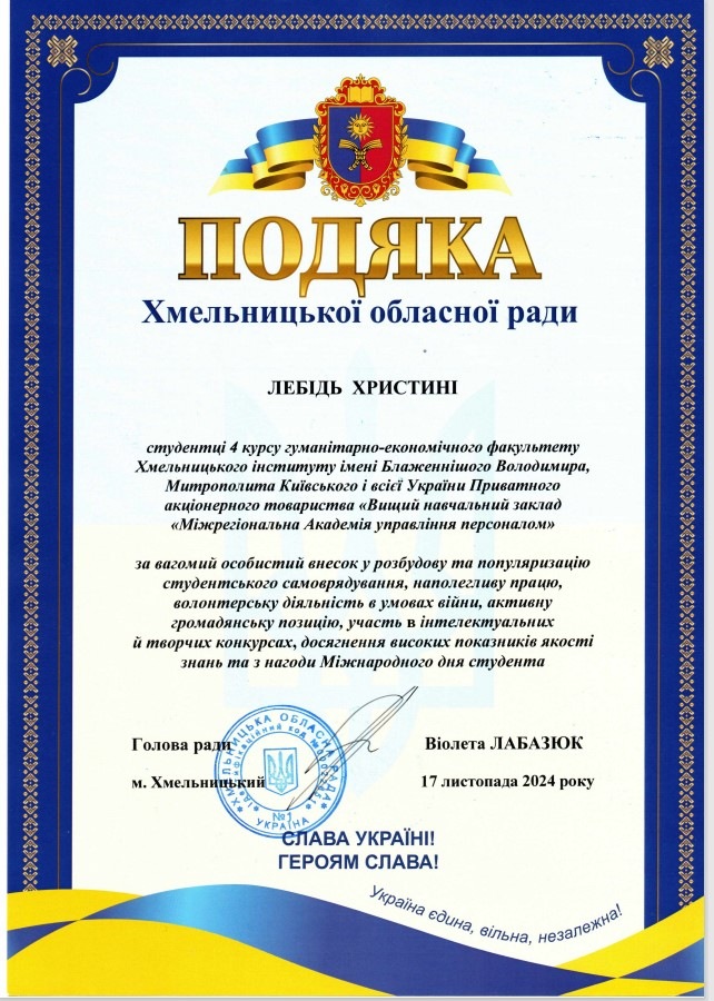 За вагомий особистий внесок у розбудову та популяризацію студентського самоврядування, наполегливу працю, волонтерську діяльність в умовах війни, активну громадянську позицію, участь в інтелектуальних й творчих конкурсах, досягнення високих показників якості знань та з нагоди Міжнародного дня студента голова обласної ради Віолета Лабазюк нагородила студентів Подяками обласної ради та пам’ятними подарунками.