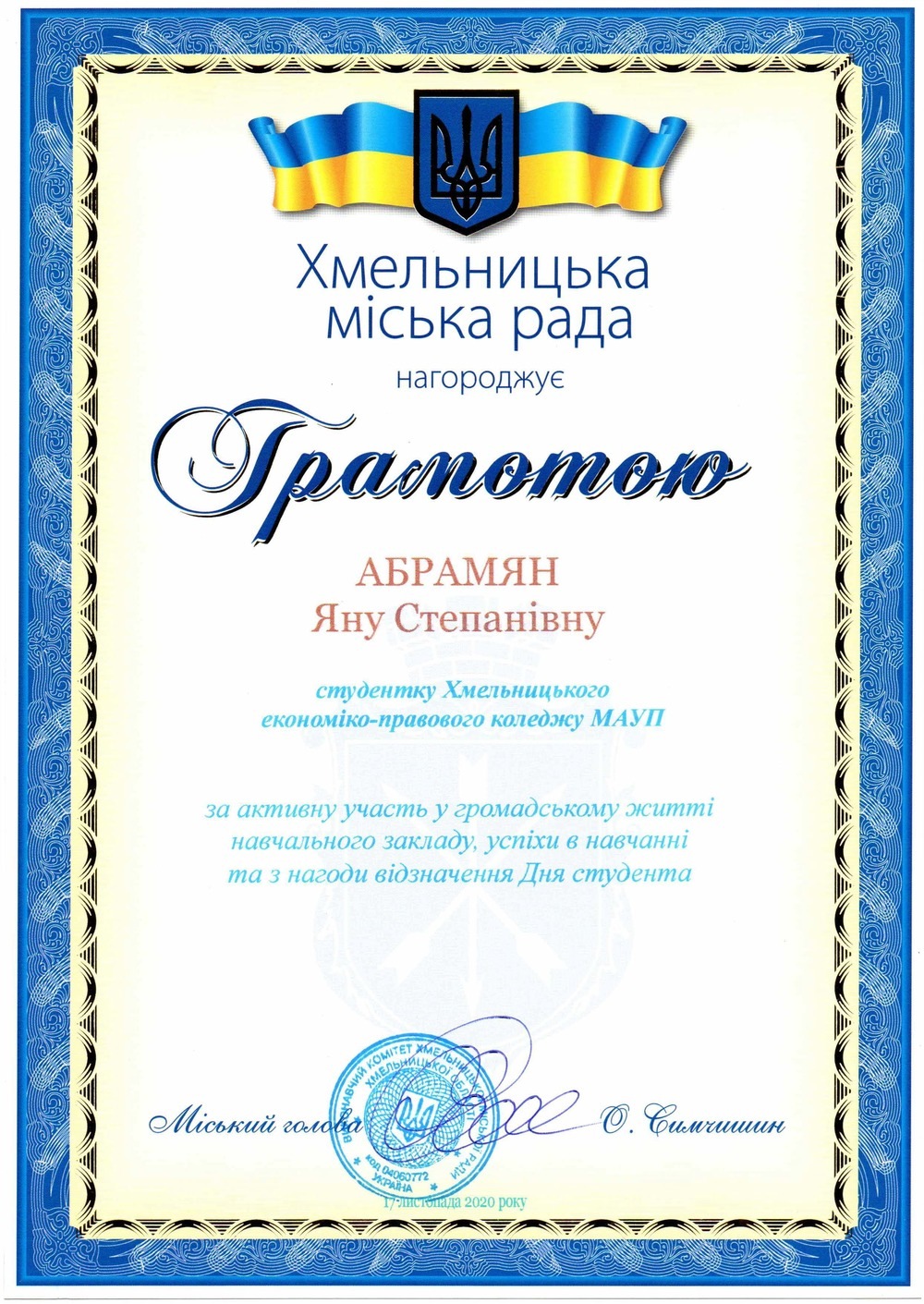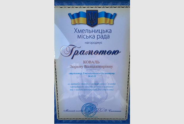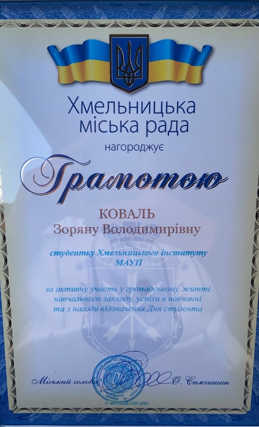 Серед десяти найкращих студентів міста було відзначено студентку Хмельницького інституту МАУП, Голову Студентської ради Зоряну Коваль та студентку Хмельницького економіко-правового коледжу МАУП Яну Абрамян.