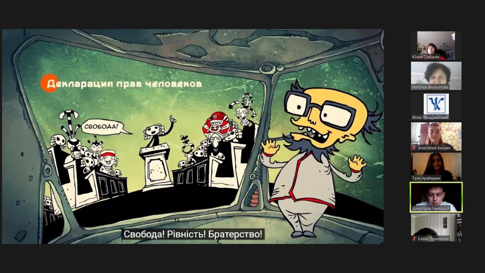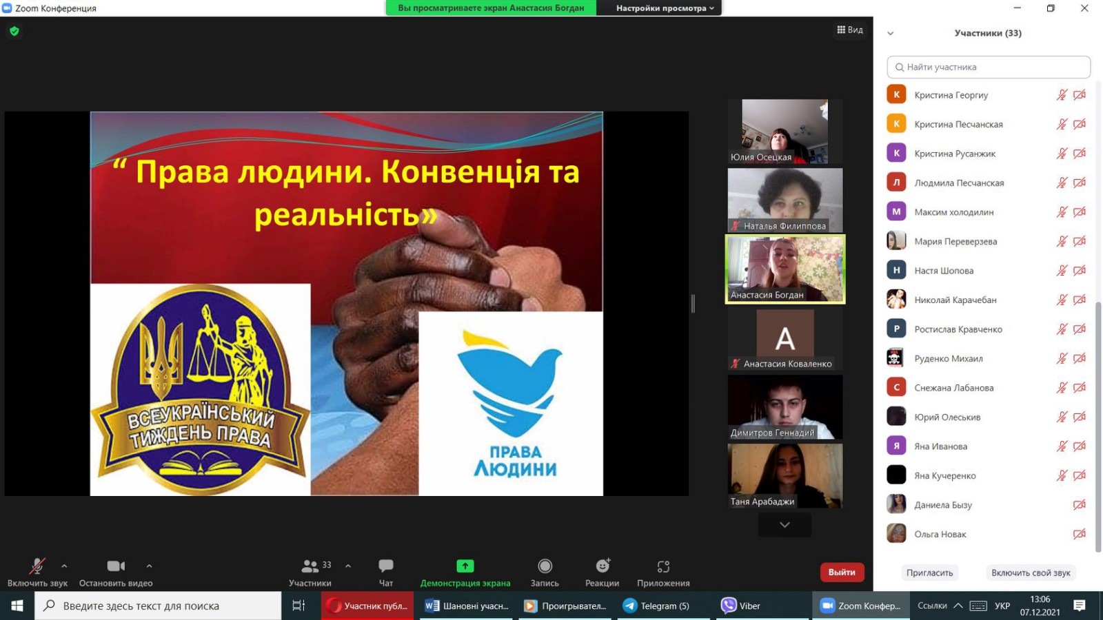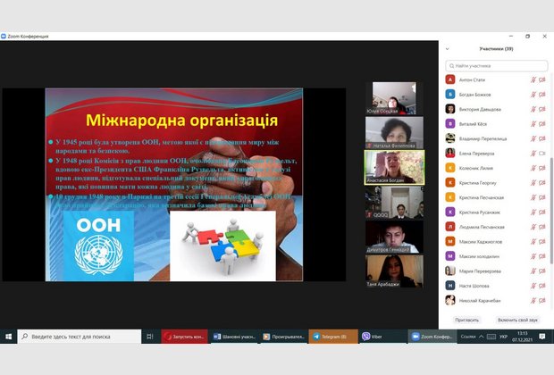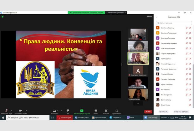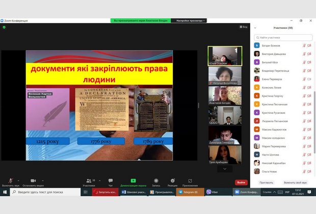 07 грудня 2021 року здобувачами вищої освіти ІІІ курсу спеціальності «Право» під керівництвом викладача кафедри права Осецької Ю.В. було презентовано правопросвітницький захід на тему «Права людини: Декларація та реальність». На захід було запрошено і здобувачів фахової передвищої освіти Кілійського транспортного фахового коледжу ДУІТ.