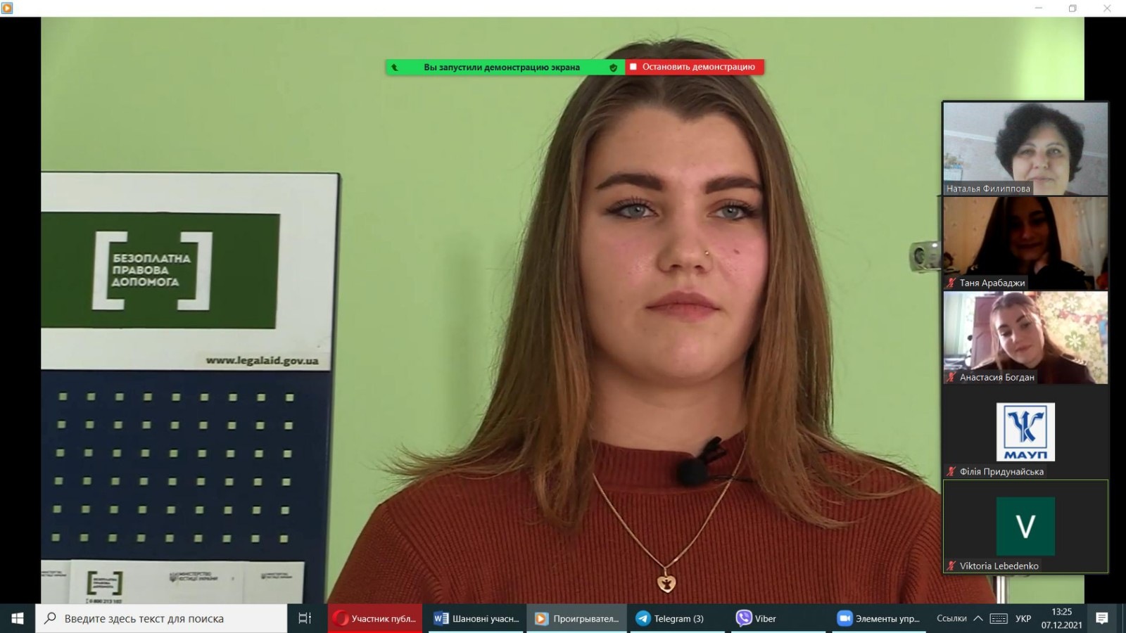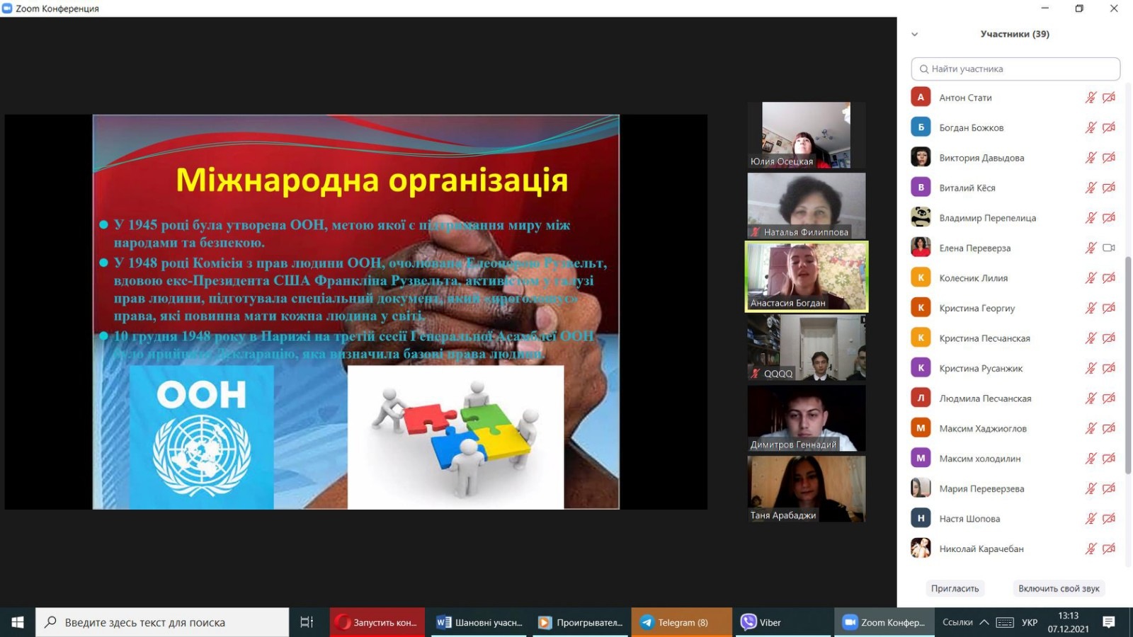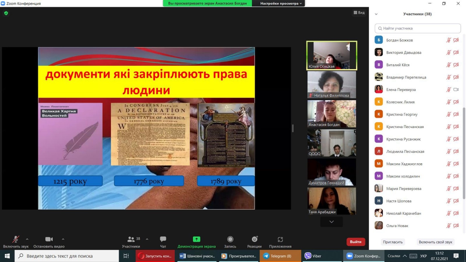 07 грудня 2021 року здобувачами вищої освіти ІІІ курсу спеціальності «Право» під керівництвом викладача кафедри права Осецької Ю.В. було презентовано правопросвітницький захід на тему «Права людини: Декларація та реальність». На захід було запрошено і здобувачів фахової передвищої освіти Кілійського транспортного фахового коледжу ДУІТ.