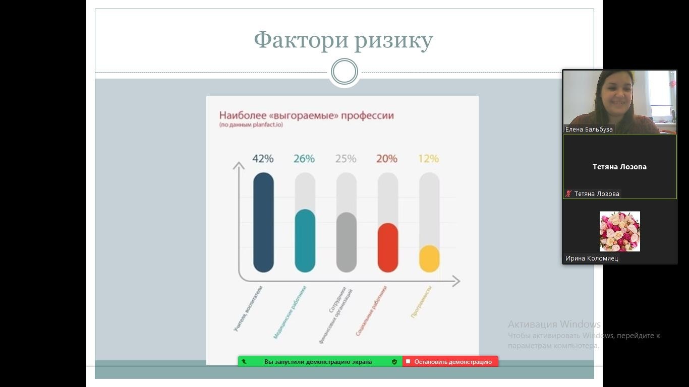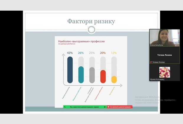 Підчас заняття викладачі ознайомились з поняттям та факторами ризику, які впливають на виникнення синдрому емоційного вигорання, пройшли експрес діагностику стану емоційного вигорання, а також мали змогу трансформувати власні стресогенні фактори у ресурси.