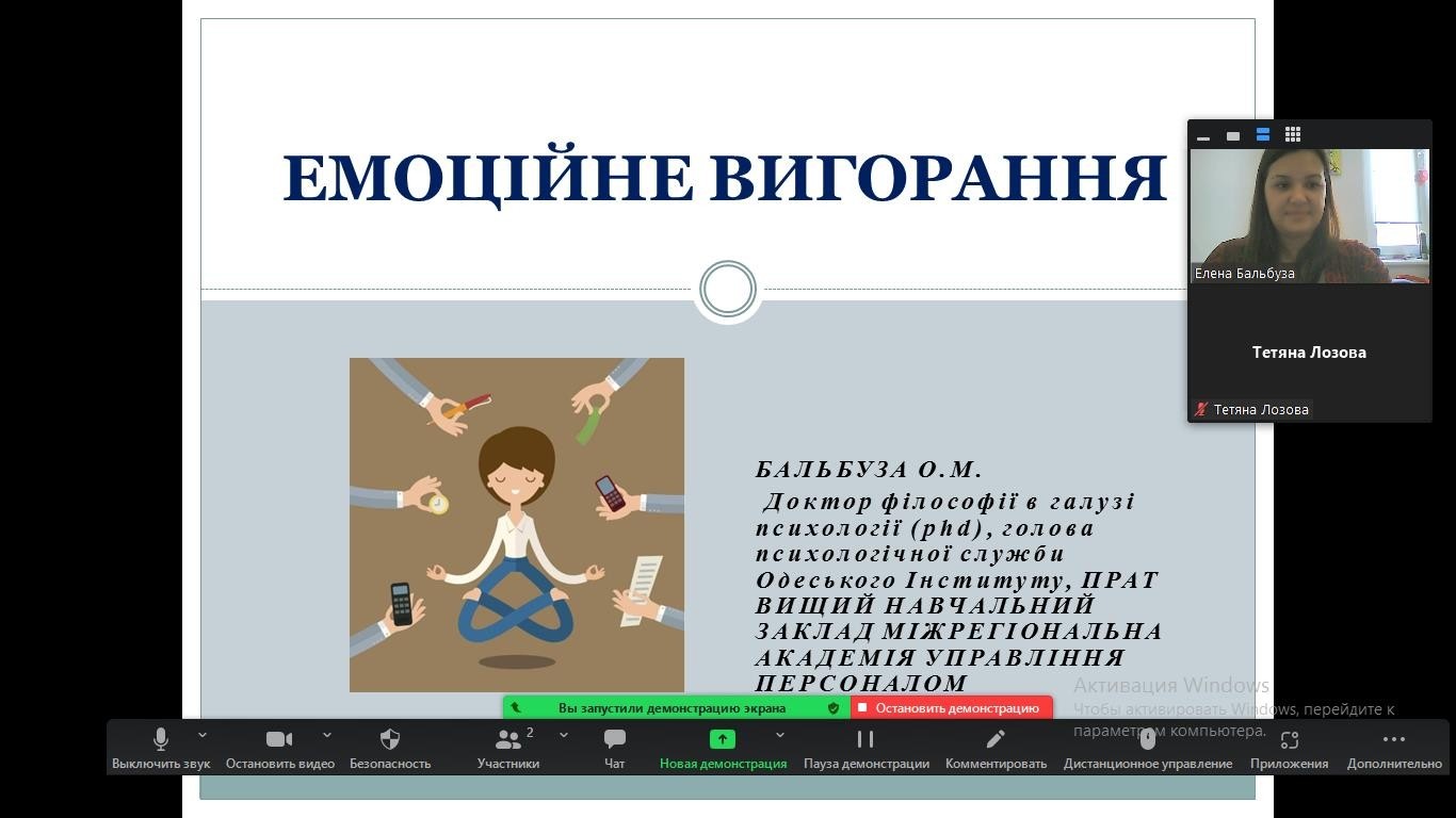 Також для викладачів Одеського інституту МАУП Олена Бальбуза провела заняття з профілактики емоційного вигорання та набуття ресурсного стану.