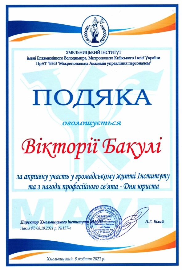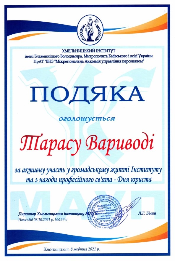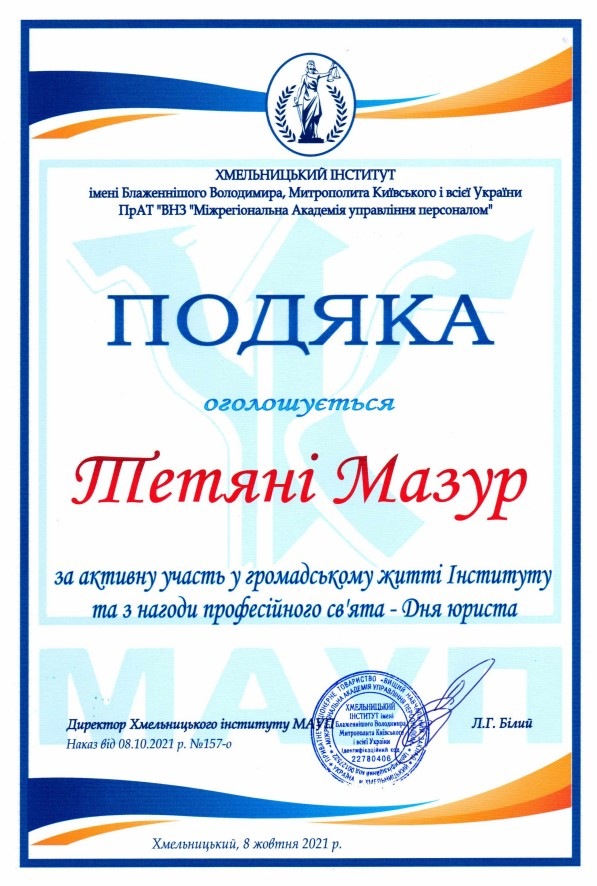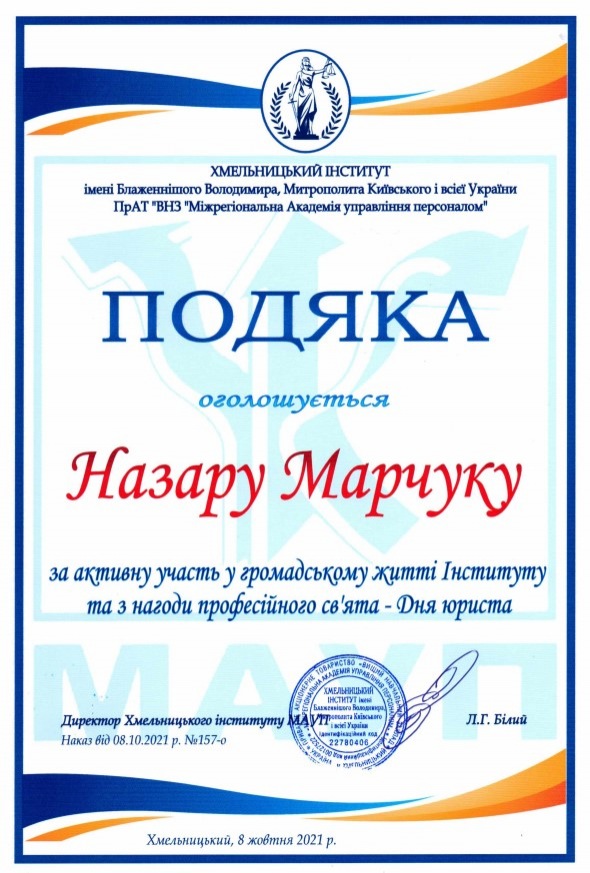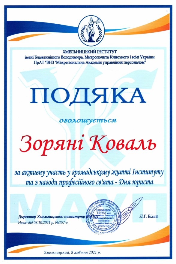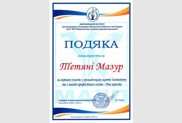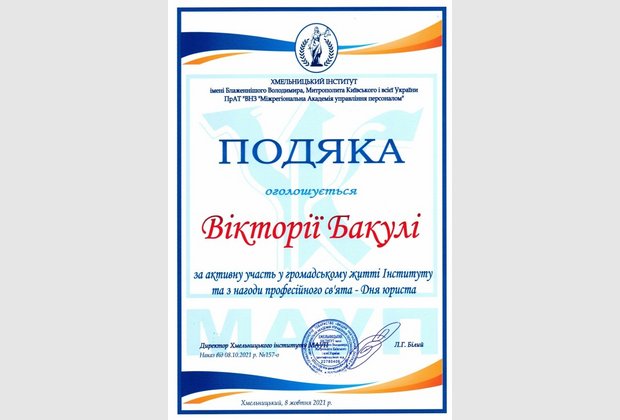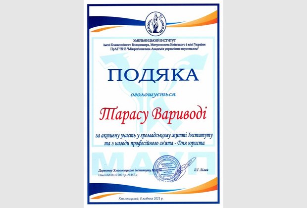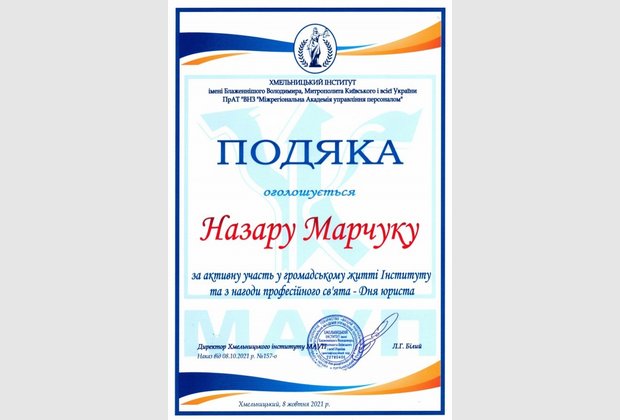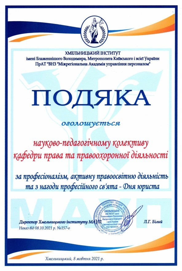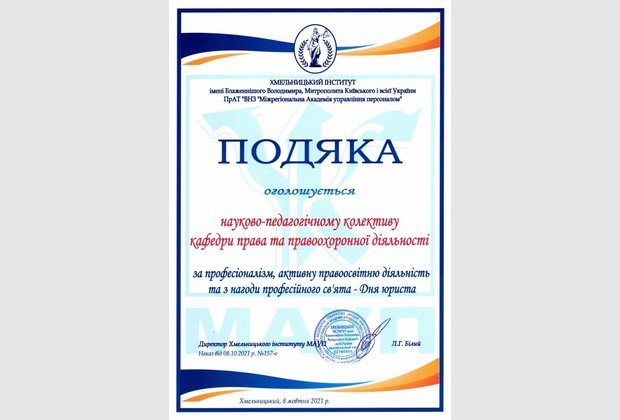 Тиждень юридичних знань виявився доволі насиченим: колектив кафедри було нагороджено за професіоналізм на активну правоосвітню діяльність, ми отримали пілотний випуск збірки наукових праць молодих вчених «Актуальні питання юридичної науки та практики», а також актив студентського колективу було нагороджено подяками з нагоди професійного свята.