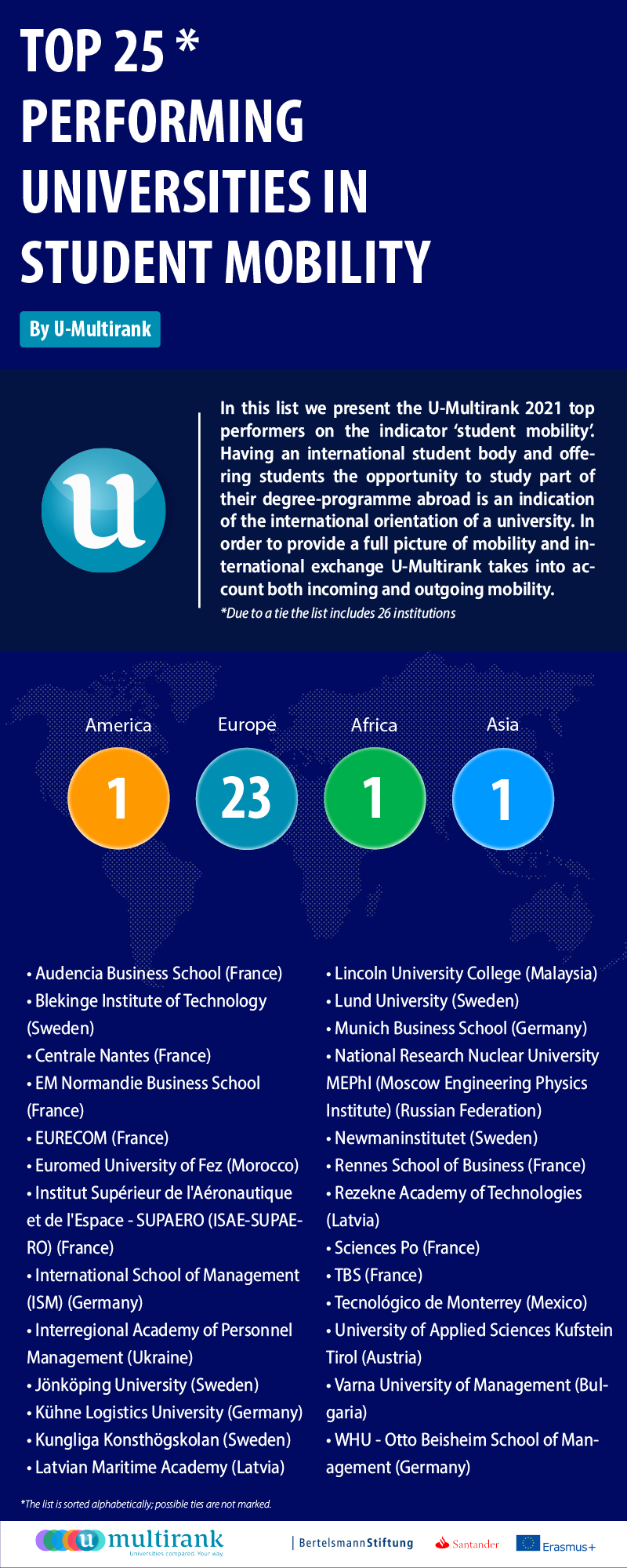 U-MULTIRANK – це незалежний розмірний міжнародний рейтинг закладів вищої освіти, що адмініструється Програмою Erasmus+ та Європейською комісією. Методика рейтингу полягає у порівнянні результатів діяльності університетів за 5 напрямами: викладання і навчання, дослідження, передавання знань, міжнародна спрямованість, регіональна спрямованість. На сьогодні це найбільший інклюзивний рейтинг, що реально відображає різноманітність вищої освіти у всьому Світі.