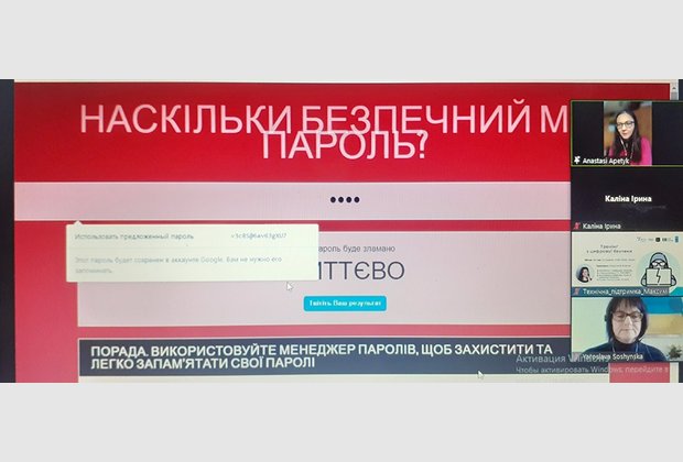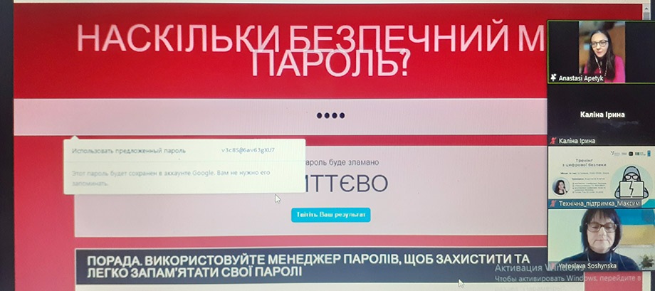 Викладачі дізналися багато цікавих цифрових фактів щодо формування паролей, їх перевірки на рівень складності злому та в майбутньому відміна, Захід проводила ВГО Українська бібліотечна асоціація у рамках «Проєкту підтримки Дія», що реалізується ПРООН за підтримки Швеції.
