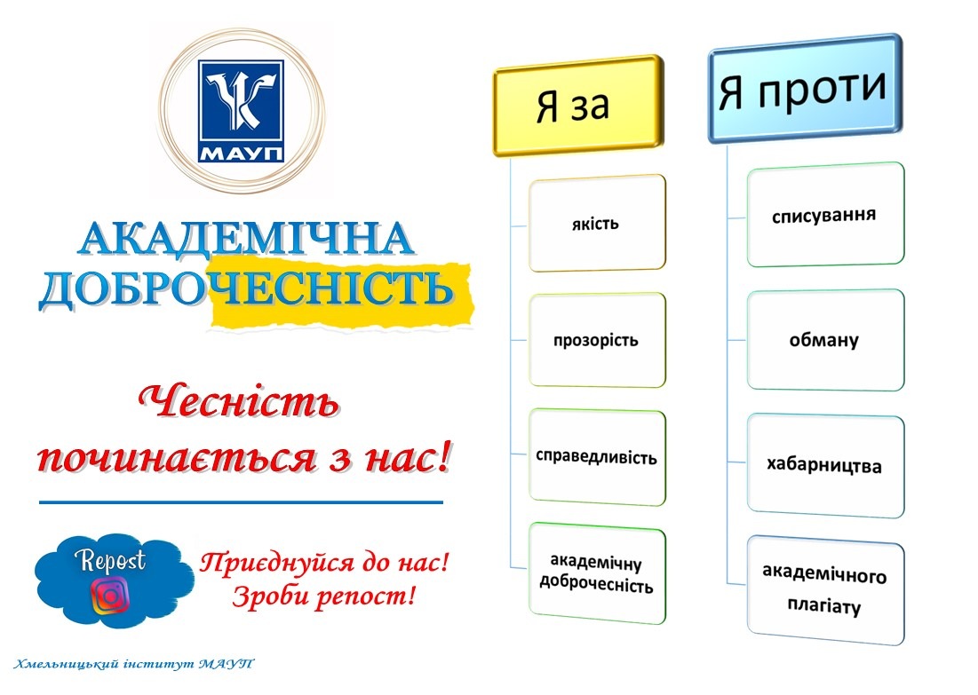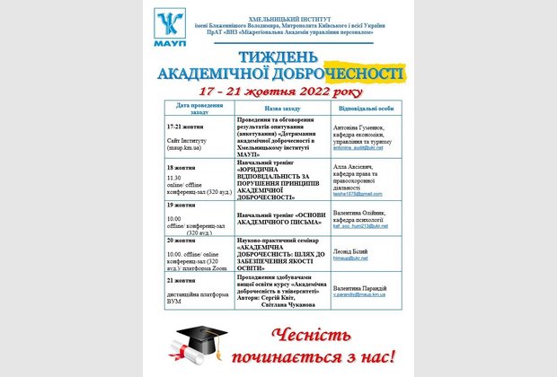 З 17 по 21 жовтня 2022 року у Хмельницькому інституті МАУП відбувався Тиждень академічної доброчесності, який складався з ряду заходів, що мають на меті популяризацію принципів академічної доброчесності серед здобувачів освіти та науково-педагогічних працівників.