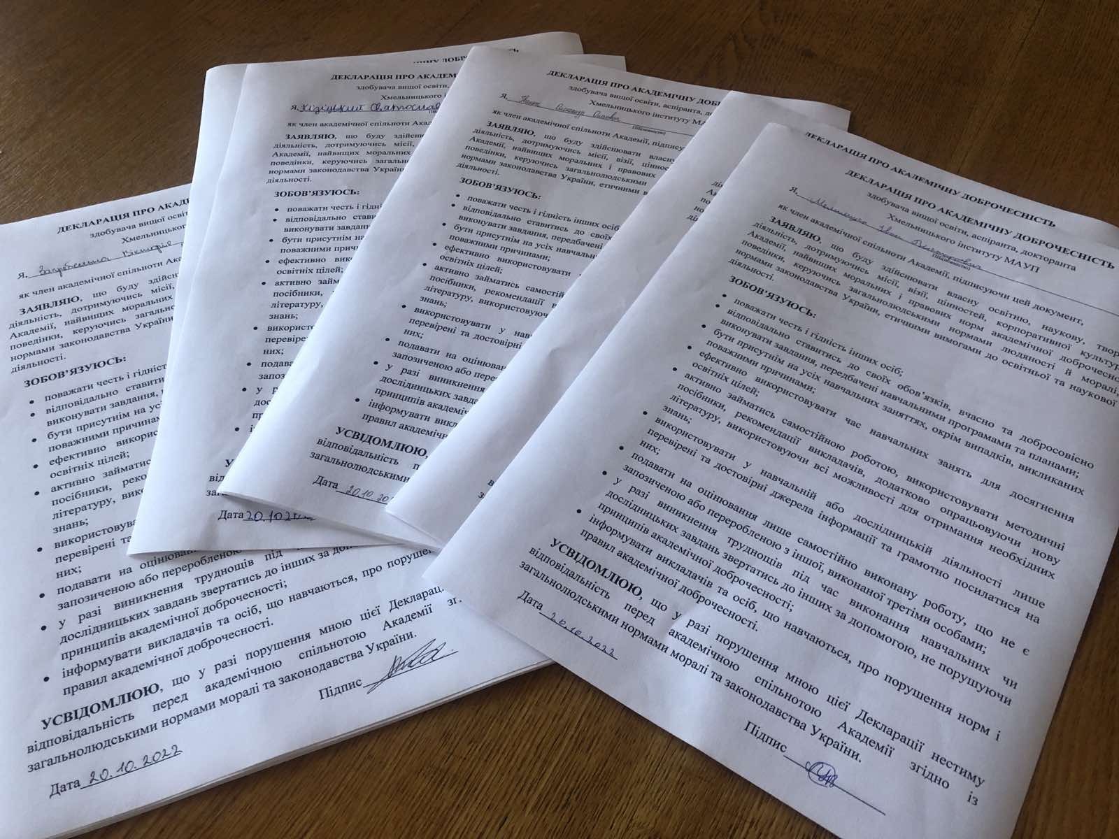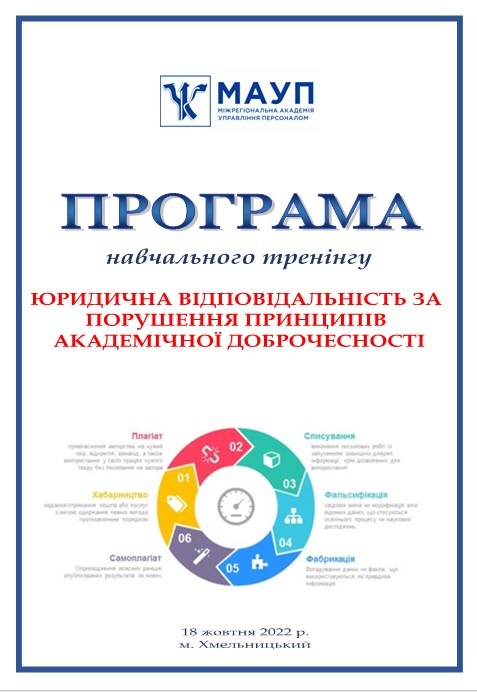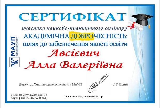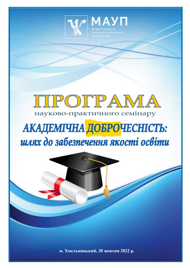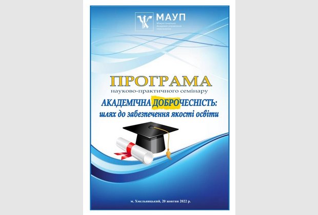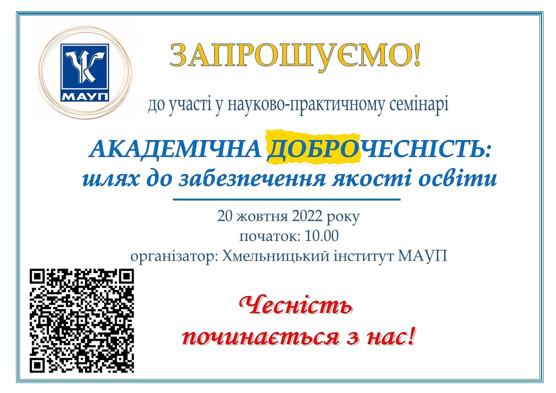 20 жовтня 2022 року відбувся науково-практичний семінар «Академічна доброчесність: шлях до забезпечення якості освіти». У заході взяли участь здобувачі вищої та фахової передвищої освіти, науково-педагогічні працівники: Хмельницького інституту МАУП; ПрАТ «ВНЗ «міжрегіональна Академія управління персоналом» (м.Київ); Хмельницького економіко-правового фахового коледжу МАУП; Одеського інституту МАУП; Одеського національного медичного університету; Міжнародного гуманітарного університету (м.Київ); Приватного вищого навчального закладу «Європейський університет» (м.Київ); Полтавського національного педагогічного університету імені В.Г. Короленка; Прикарпатського національного університету імені Василя Стефаника (м.Івано-Франківськ); Глухівський національний педагогічний університет імені Олександра Довженка (м.Глухів, Сумська обл.); Державного біотехнологічного університету (м.Харків); Хмельницького національного університету; Мелітопольського державного педагогічного університету імені Богдана Хмельницького (м.Мелітополь, Запорізька обл.); Хмельницького політехнічного фахового коледжу Національного університету «Львівська політехніка»; Чернівецького національного університету імені Юрія Федьковича; Запорізького національного університету; Новоград–Волинського ЗДО №6 «Дзвіночок» (Житомирська обл.); Національного університету «Чернігівський колегіум» (м.Чернігів).