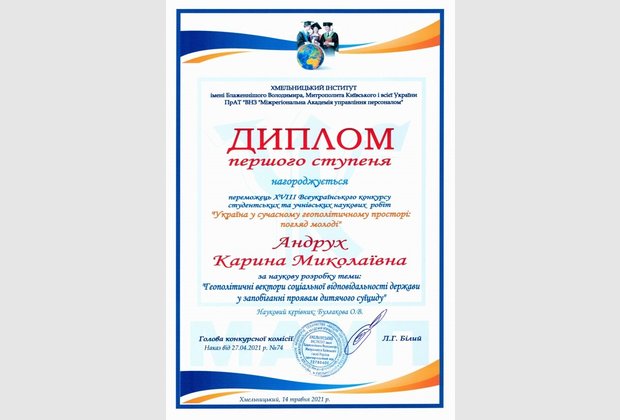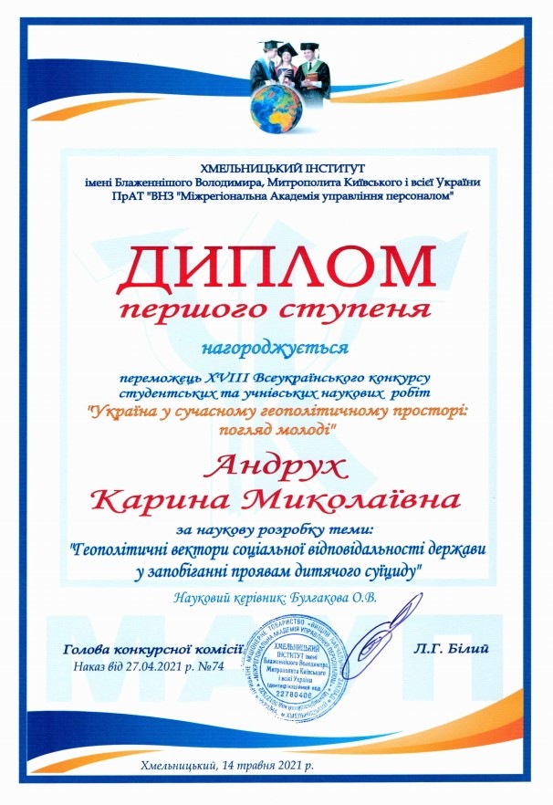 Андрух Карину Миколаївну (здобувачка вищої освіти спеціальності «Правоохоронна діяльність» Донецького юридичного інституту МВС України (м.Кривий Ріг) за наукову розробку теми: «Геополітичні вектори соціальної відповідальності держави у запобіганні проявам дитячого суїциду» та оголосити подяку науковому керівнику кандидату економічних наук, доценту Булгаковій Олені Валеріївні.
