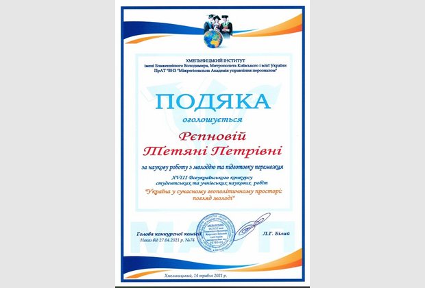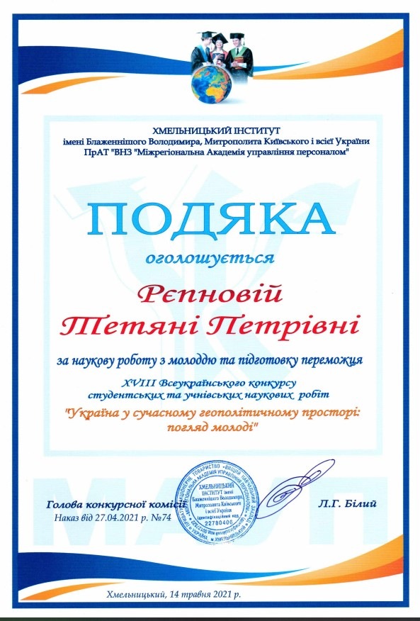 Черкасової-Лисої Поліни Дмитрівни (Здобувачки вищої освіти спеціальності «Психології» Хмельницького інституту МАУП). За наукову роботу: «Особливості використання можливостей мережі інтернет у психологічних дослідженнях». Науковий керівник: старший викладач Черкасова Тетяна Михайлівна.