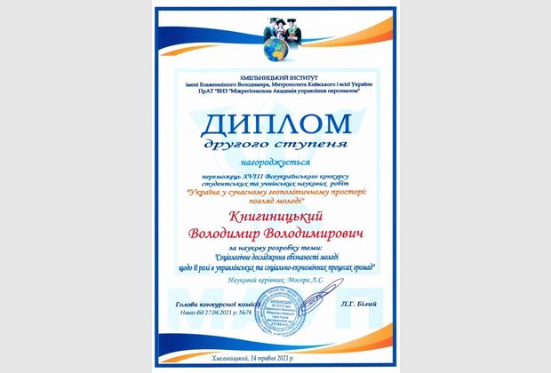 Курачинова Володимира Ігоровича (здобувача вищої освіти Хмельницького інституту МАУП) за наукову роботу «Стадії розвитку особистості в різних психологічних концепціях». Науковий керівник: кандидат педагогічних наук, доцент Олійник Валентина Василівна.