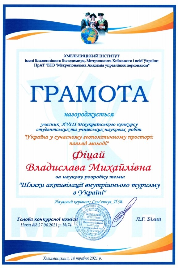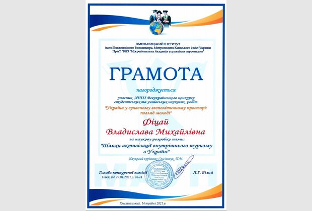 Фіцай Владиславі Михайлівні (Здобувачці вищої освіти спеціальності «Туризм» Хмельницького інституту МАУП) за наукову розробку теми: «Шляхи активізації внутрішнього туризму в Україні» та оголосити подяку науковому керівнику: кандидату економічних наук Сем’янчуку Петру Михайловичу.