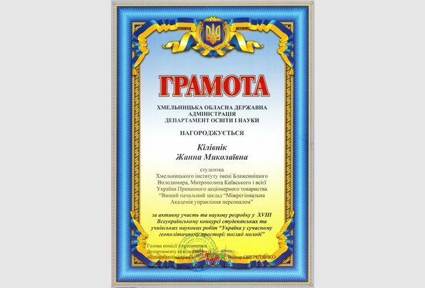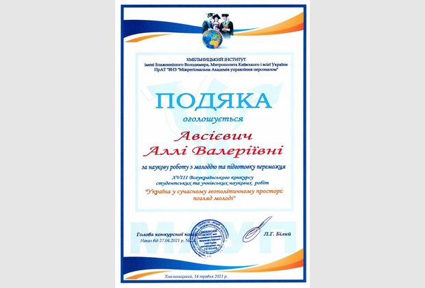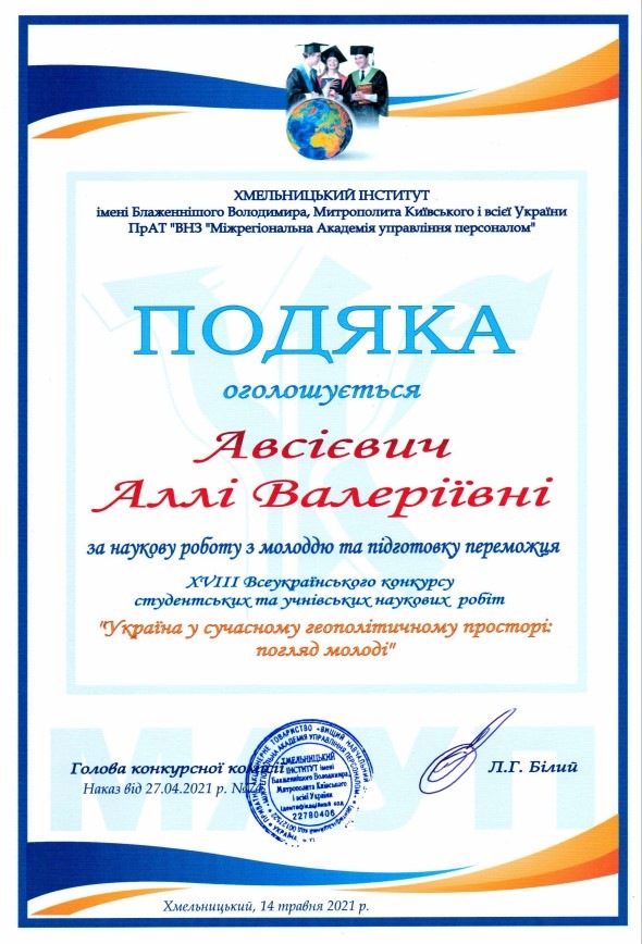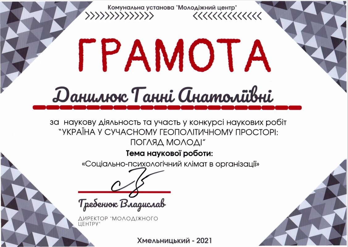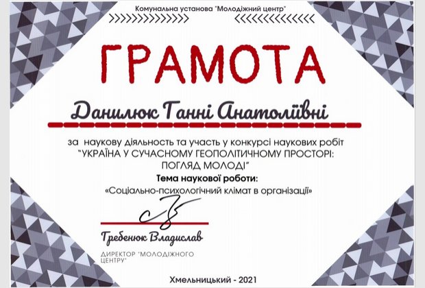 Данилюк Ганни Анатоліївни (здобувачки вищої освіти 3 курсу Хмельницького інституту МАУП) за наукову роботу «Соціально-психологічний клімат в організації». Науковий керівник: кандидат педагогічних наук, доцент Олійник Валентина Василівна.