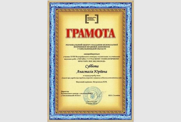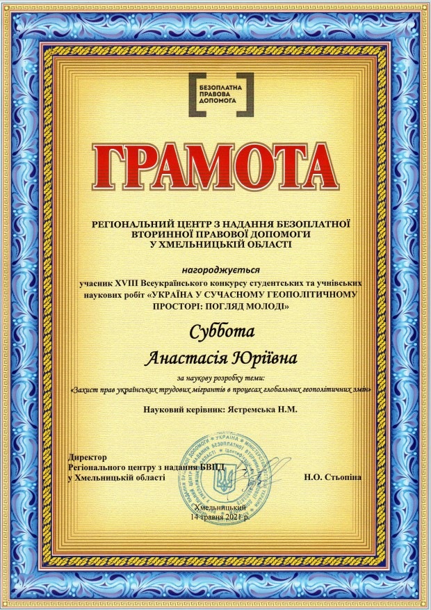 Субботи Анастасії Юріївни (Здобувачки вищої освіти спеціальності «Правоохоронна діяльність» Донецького юридичного інституту МВС України (м.Кривий Ріг) за наукову розробку теми: «Захист прав українських трудових мігрантів в процесах глобальних геополітичних змін». Науковий керівник: кандидат економічних наук Ястремська Наталя Миколаївна