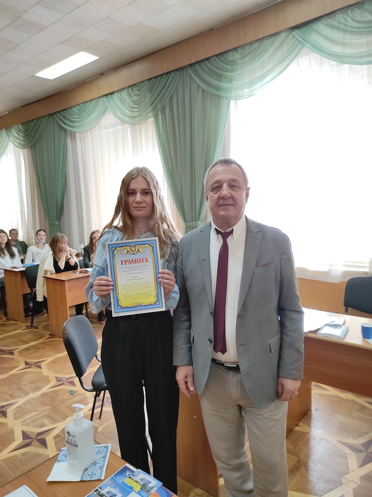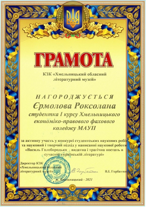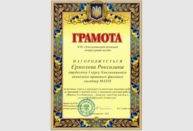 Єрмолової Роксолани Юріївни (Здобувачки фахової передвищої освіти спеціальності «Право» Хмельницького економіко-правового фахового коледжу МАУП). За наукову роботу: «Василь Голобородько – видатна і трагічна постать в сучасній українській літературі». Науковий керівник: кандидат педагогічних наук, доцент Олійник Валентина Василівна.