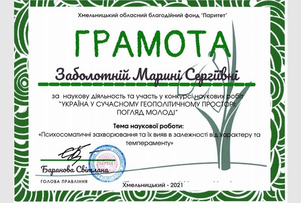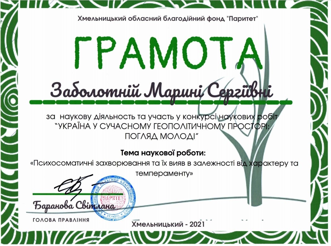 Заболотної Марини Сергіївни (магістрантки 2 курсу Хмельницького інституту МАУП) за наукову роботу «Психосоматичні захворювання та їх вияв в залежності від характеру та темпераменту». Науковий керівник: старший викладач Черкасова Тетяна Михайлівна.
