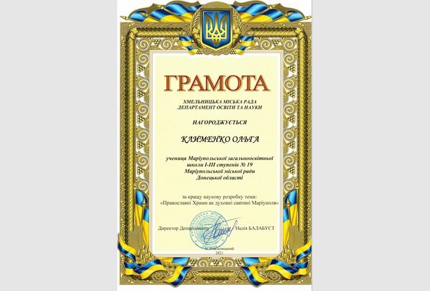 Клименко Ольги (учениці комунального закладу «Маріупольська загальноосвітня школа І-ІІІ ступенів № 19 Маріупольської міської ради Донецької області»). За наукову розробку теми: «Православні Храми як духовні святині Маріуполя». Науковий керівник: учитель Рубленко Владислав Миколайович