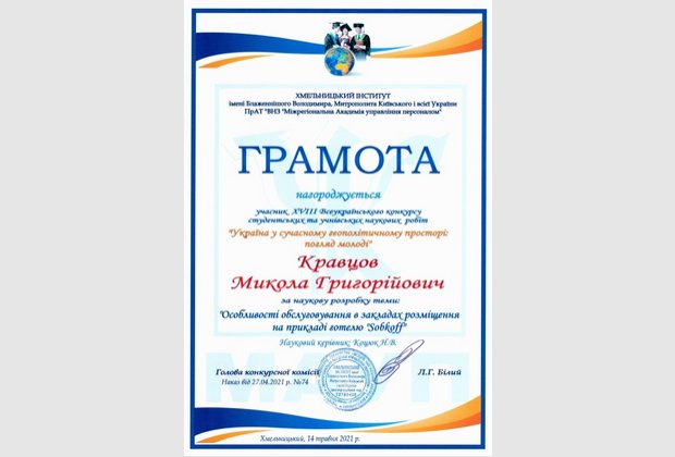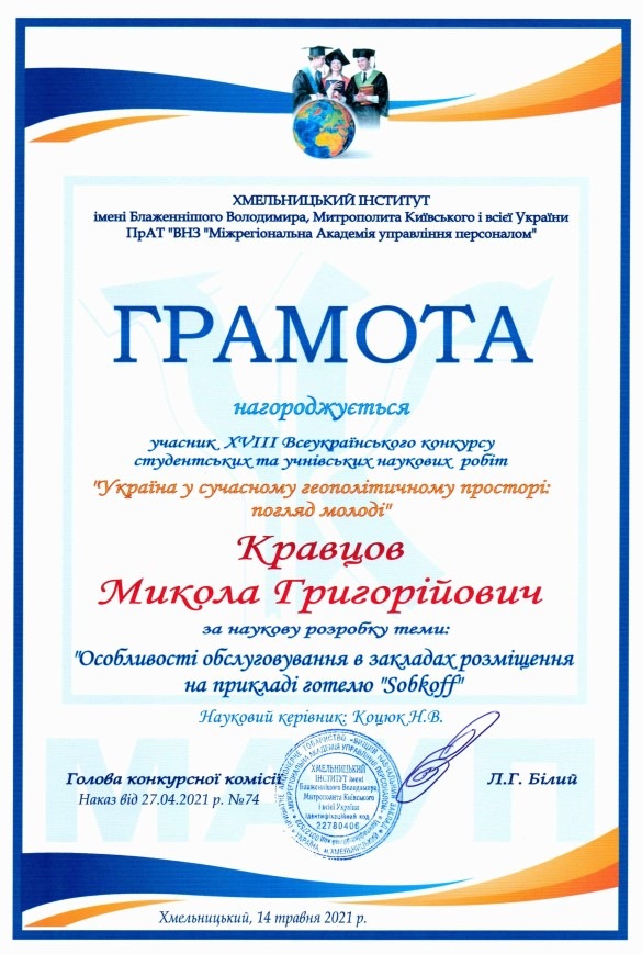 Кравцова Миколу Григорійовича (здобувача вищої освіти спеціальності «Туризм» Хмельницького інституту МАУП) за наукову розробку теми: «Особливості обслуговування в закладах розміщення на прикладі готелю «Sobkoff» та оголосити подяку науковому керівнику: старшому викладачу Коцюк Наталії Володимирівні.
