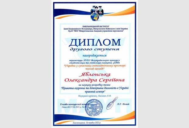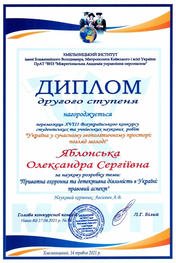 Яблонську Олександру Сергіївну (здобувачку вищої освіти спеціальності «Право» Хмельницького інституту МАУП) за наукову розробку теми: «Приватна охоронна та детективна діяльність в Україні: правовий аспект» та оголосити подяку науковому керівнику доктору філософії в галузі права (PhD) Авсієвич Алла Валеріївна.