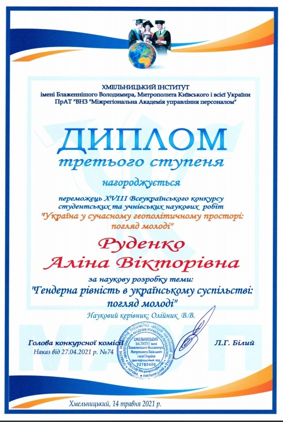 Руденко Аліну Вікторівну (здобувачку вищої освіти спеціальності «Психологія» Хмельницького інституту ПрАТ «ВНЗ «Міжрегіональна Академія управління персоналом») за наукову розробку теми: «Гендерна рівність в українському суспільстві: погляд молоді» та оголосити подяку науковому керівнику кандидату педагогічних наук, доценту Олійник Валентині Василівні.