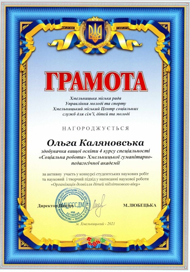 Каляновської Ольги (здобувачки вищої освіти спеціальності «Соціальна робота» Хмельницької гуманітарно-педагогічної академії). За наукову роботу: «Організація дозвілля дітей підліткового вікуку». Науковий керівник: кандидат педагогічних наук Поляновська Ольга Романівна.