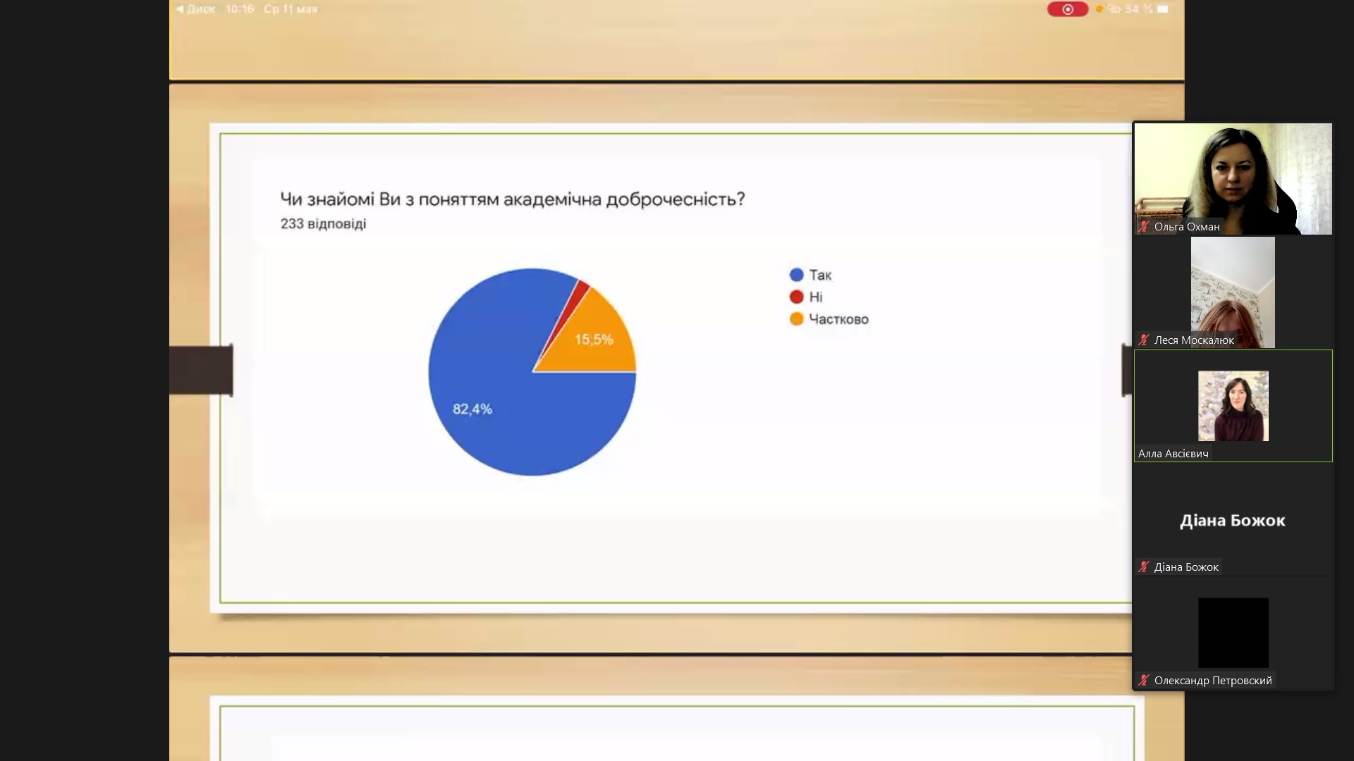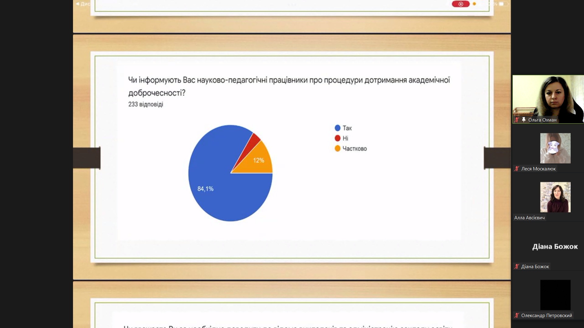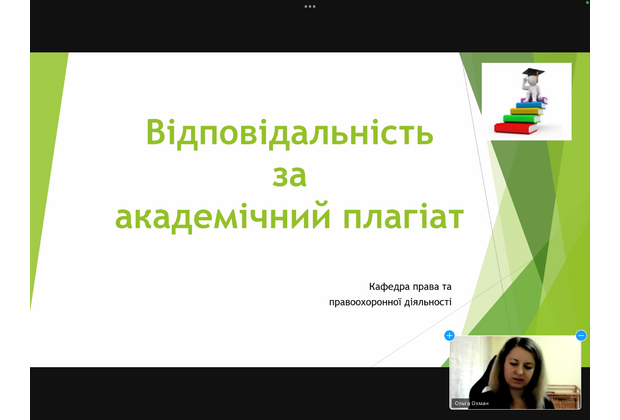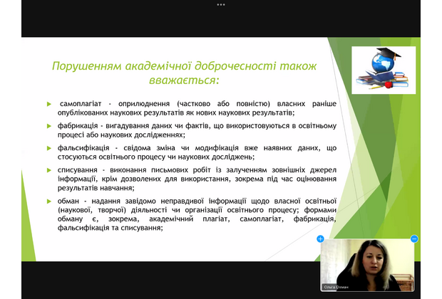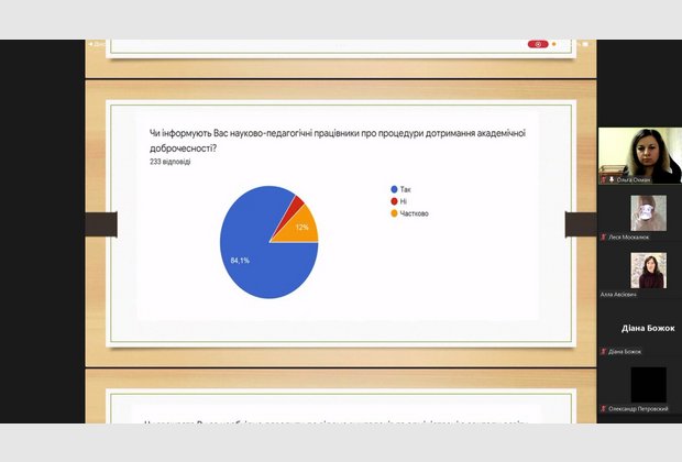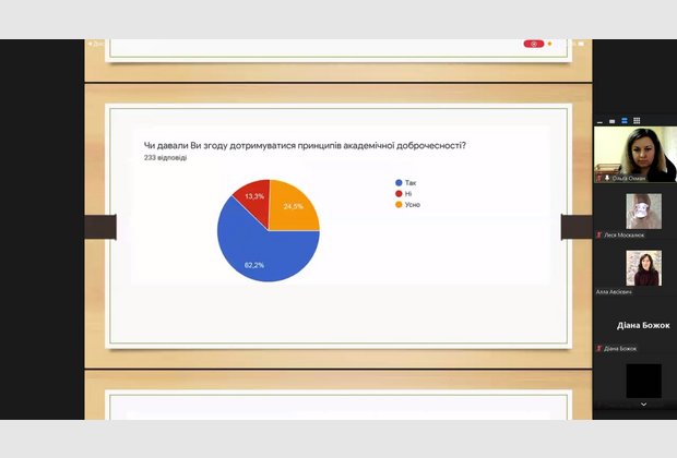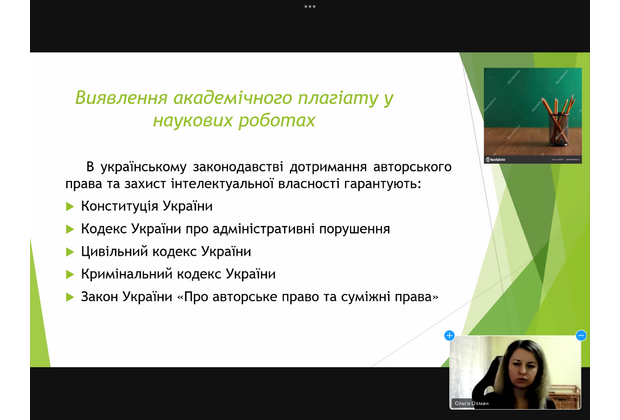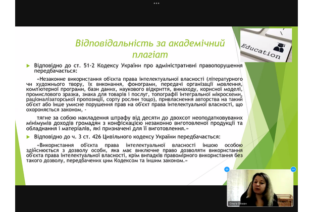 Учасники навчального вебінару дізнались про результати моніторингового опитування на тему «Що я знаю про академічну доброчесність»; особливості різних видів відповідальності за порушення академічної доброчесності; онлайн платформи для самостійної перевірки академічних текстів на наявність плагіату.