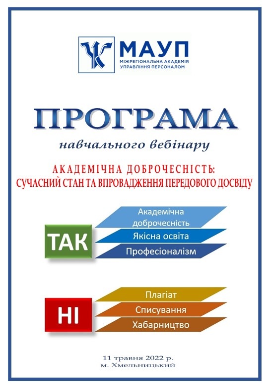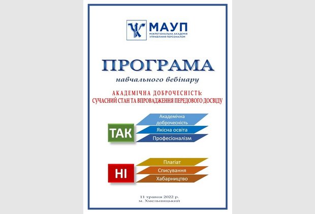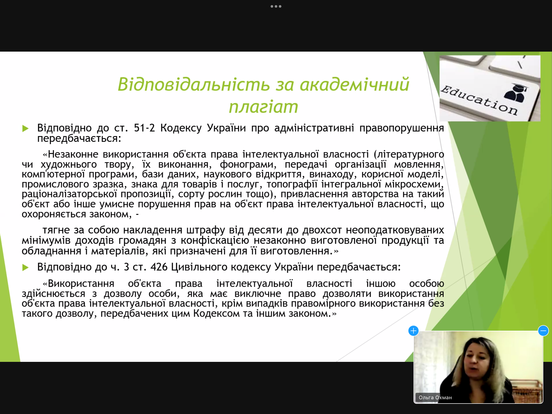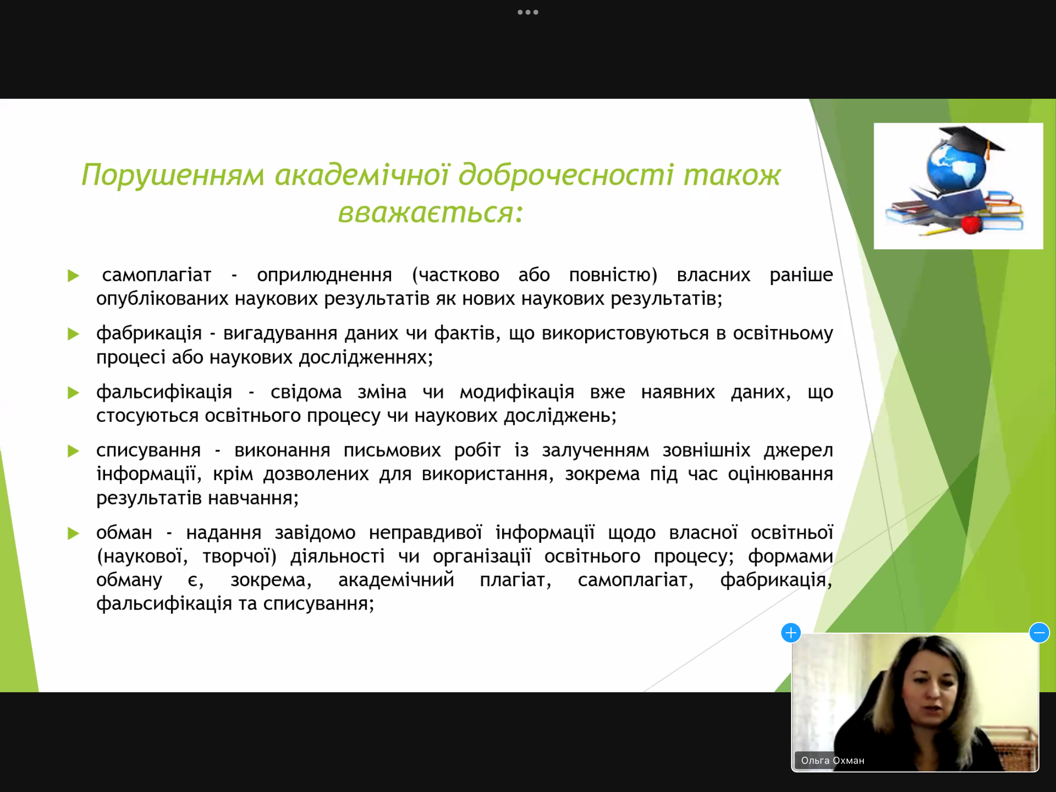 Учасники навчального вебінару дізнались про результати моніторингового опитування на тему «Що я знаю про академічну доброчесність»; особливості різних видів відповідальності за порушення академічної доброчесності; онлайн платформи для самостійної перевірки академічних текстів на наявність плагіату.