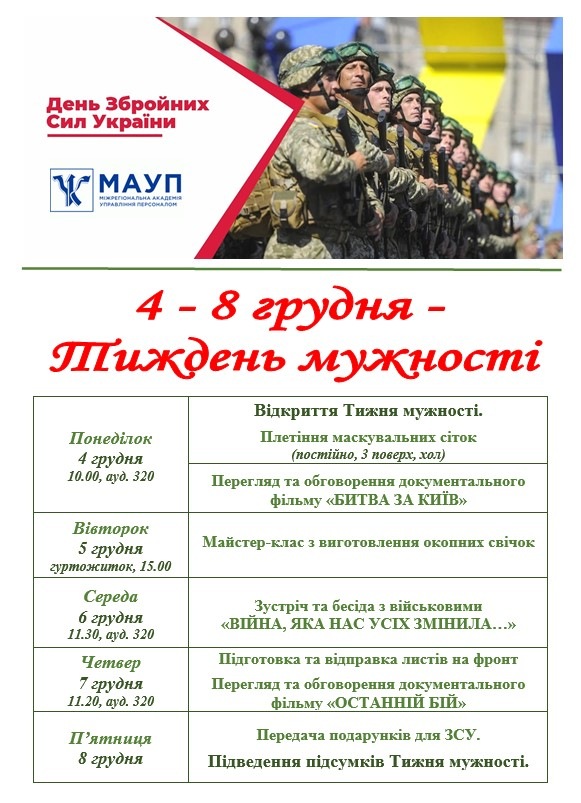 У Хмельницькому інституті МАУП з 4 по 8 грудня 2023 року до Дня Збройних Сил України відбувається Тиждень мужності, в рамках якого заплановано ряд заходів.