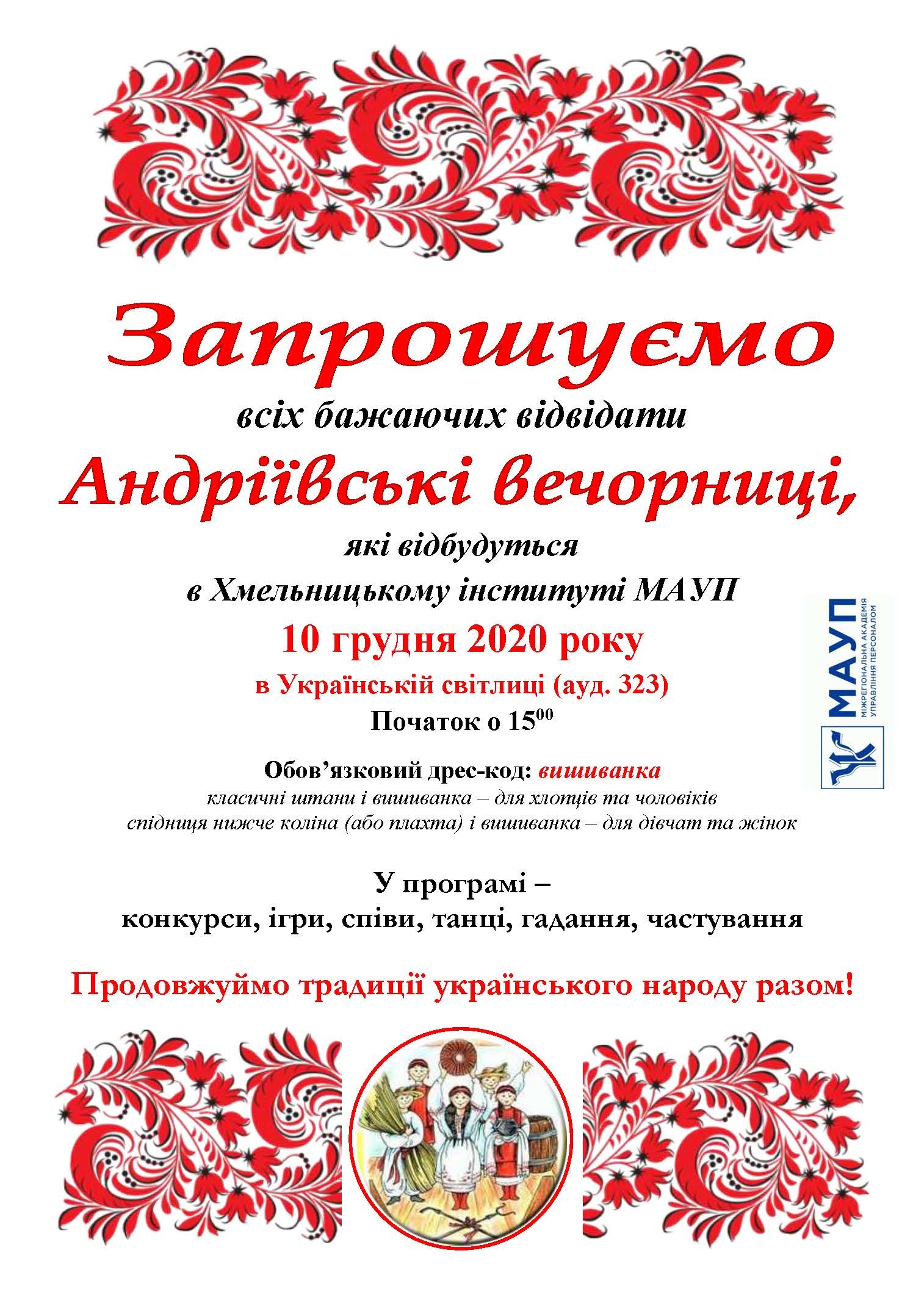 10 листопада 2020 року напередодні свята Андрія у Хмельницькому інституті МАУП відбулися Андріївські вечорниці.